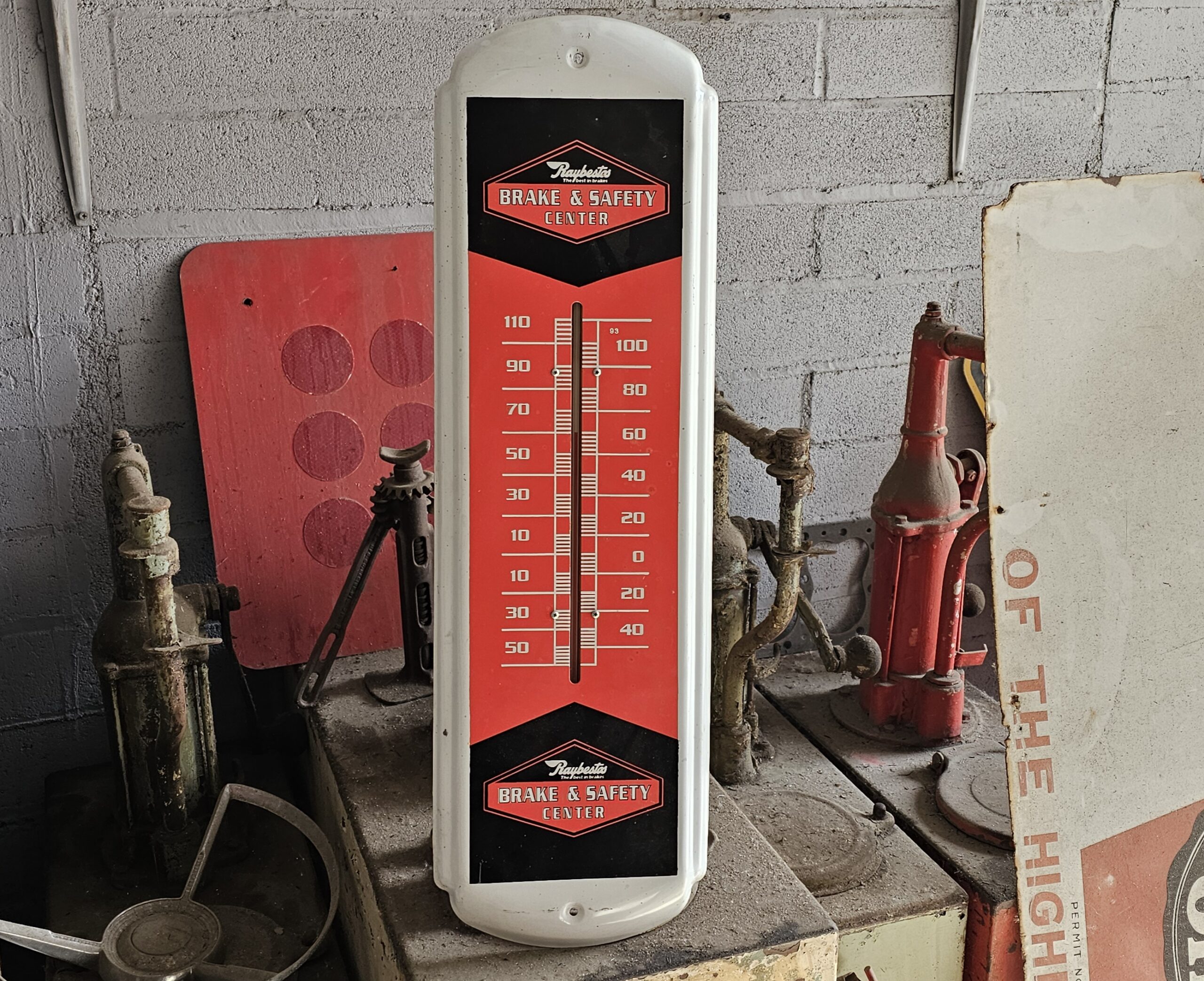 Raybestos Brake Safety Center Thermometer Good vintage condition. The thermometer seems to read properly and is in great shape. You can see minor scratching at top and bottom in pictures.. Been on the walls of my shop for 15 years, but just don't have the wall space in Grumpsville for everything. Grumps Collectibles So-Cal.