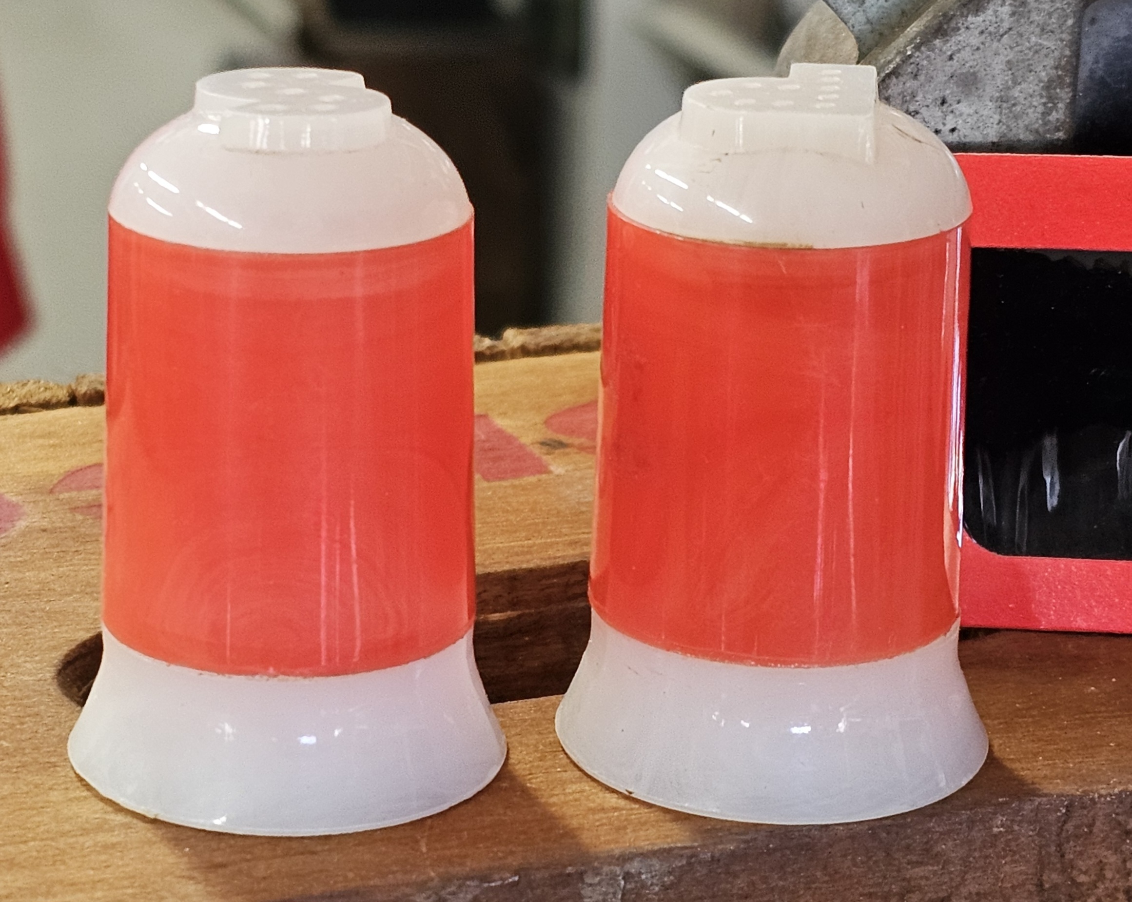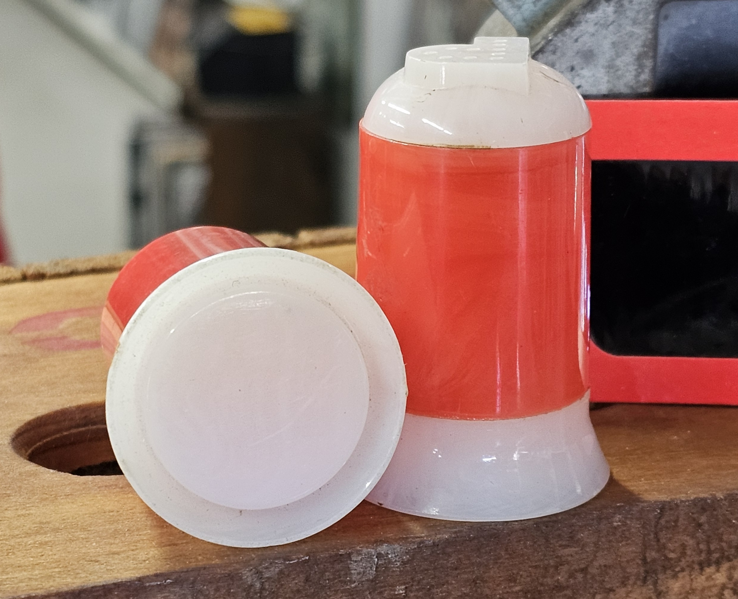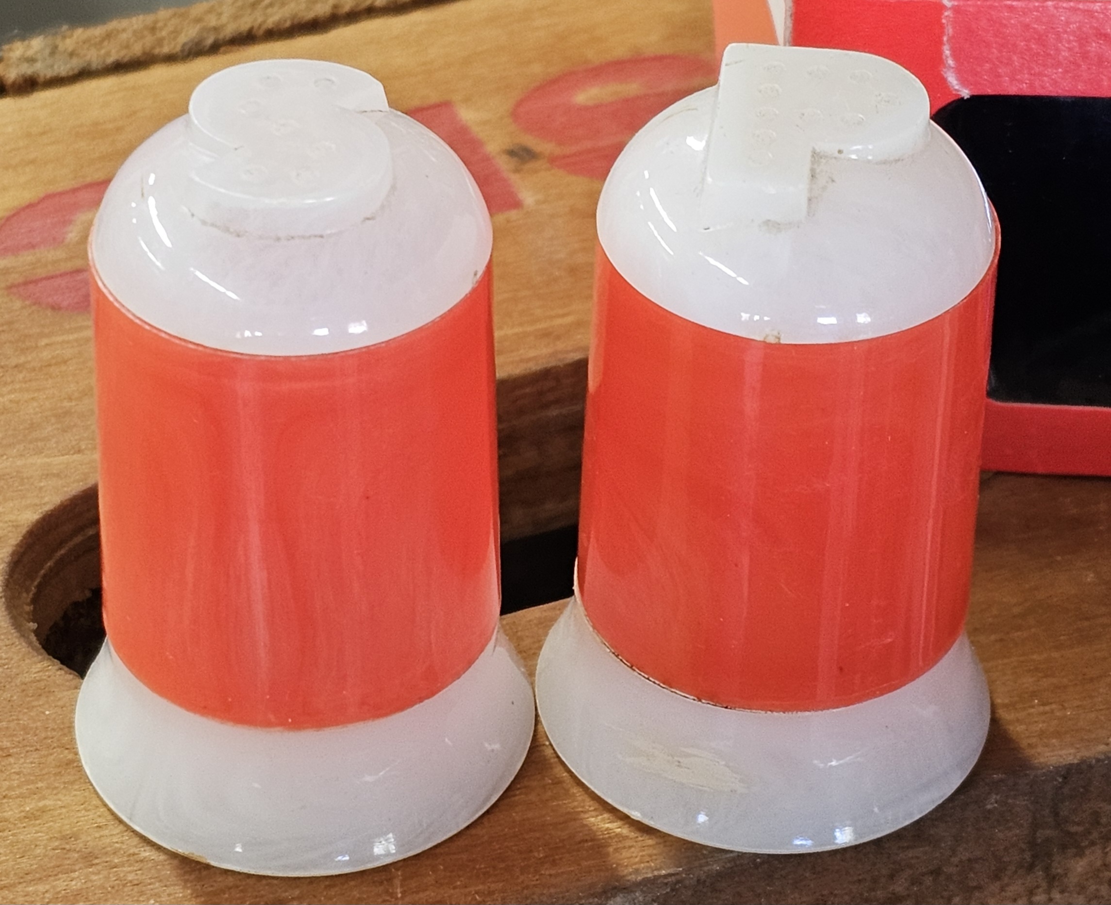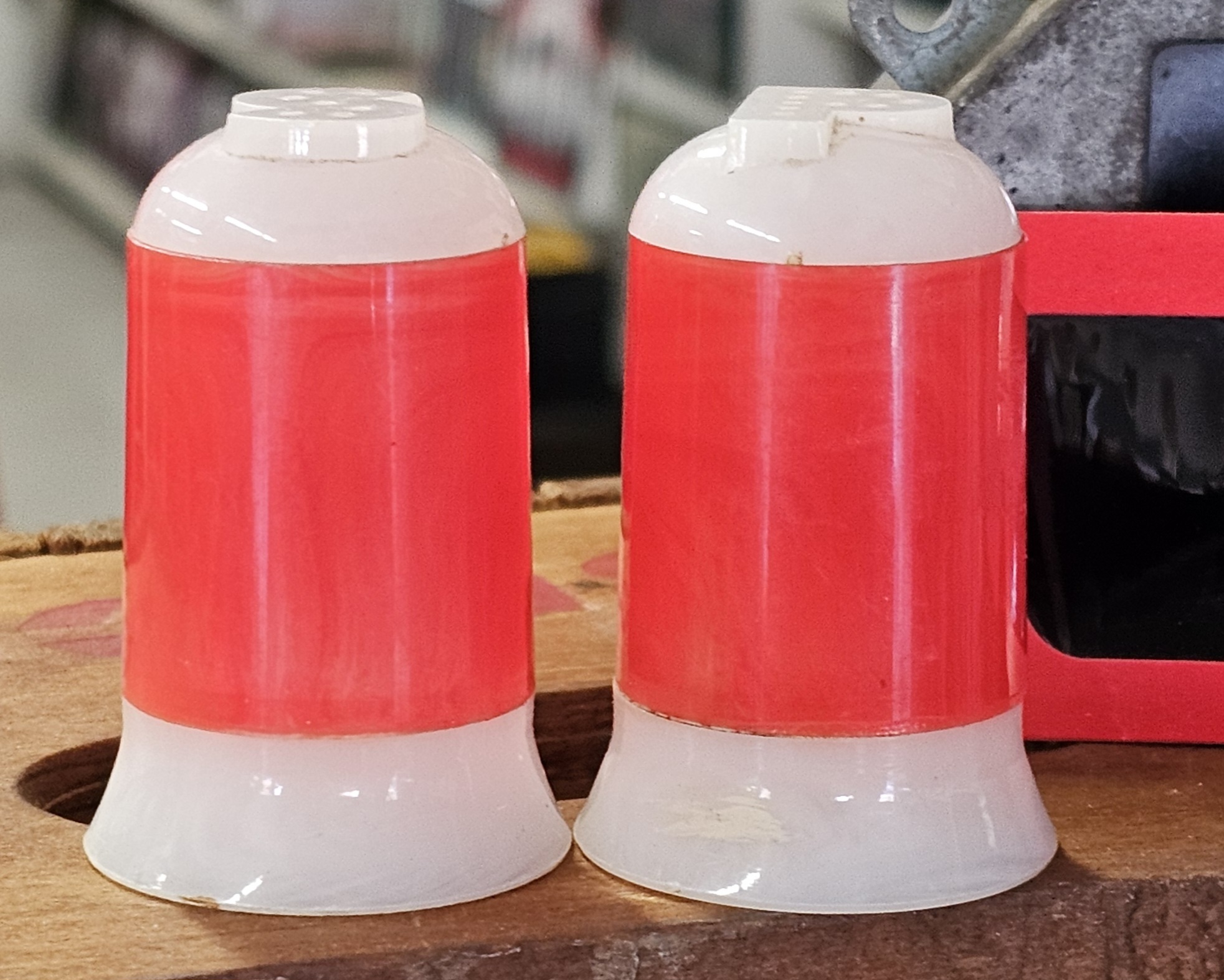 Red White Salt Pepper Set Very nice shape originals. Salt red is slightly faded compared to pepper and art is a bit more used looking. Neat set, lids have 'S' for salt and 'P' for pepper on lids. Perfect addition to any vintage kitchen at home or in trailer.