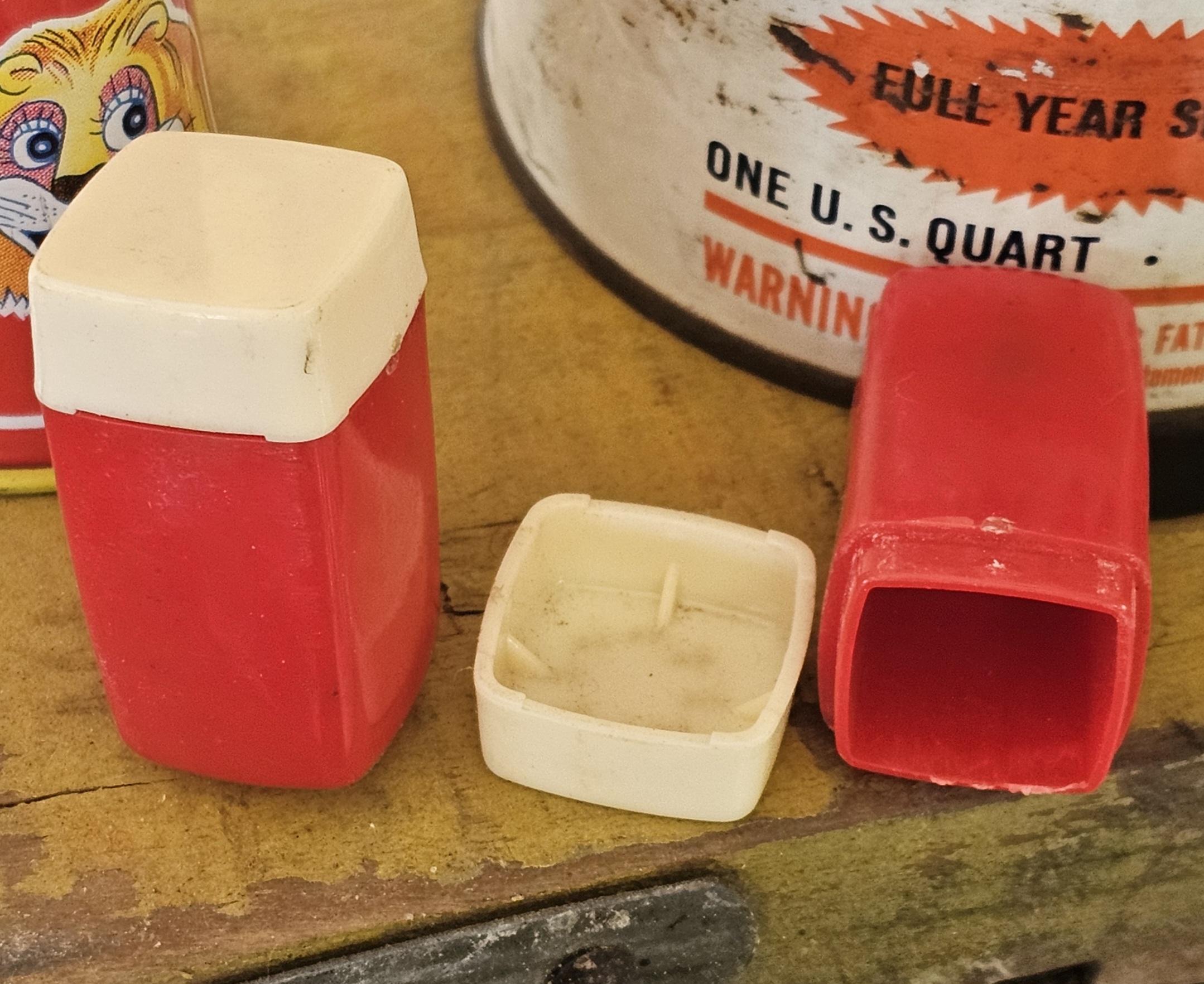 Red White Salt Pepper Shakers  These are a cute small little set.  Marked with S & P on tops.  White bottoms are removeable to add product.  No need for modern retro garbage when real American products are here at your fingertips.  Grumps Collectibles So-Cal.