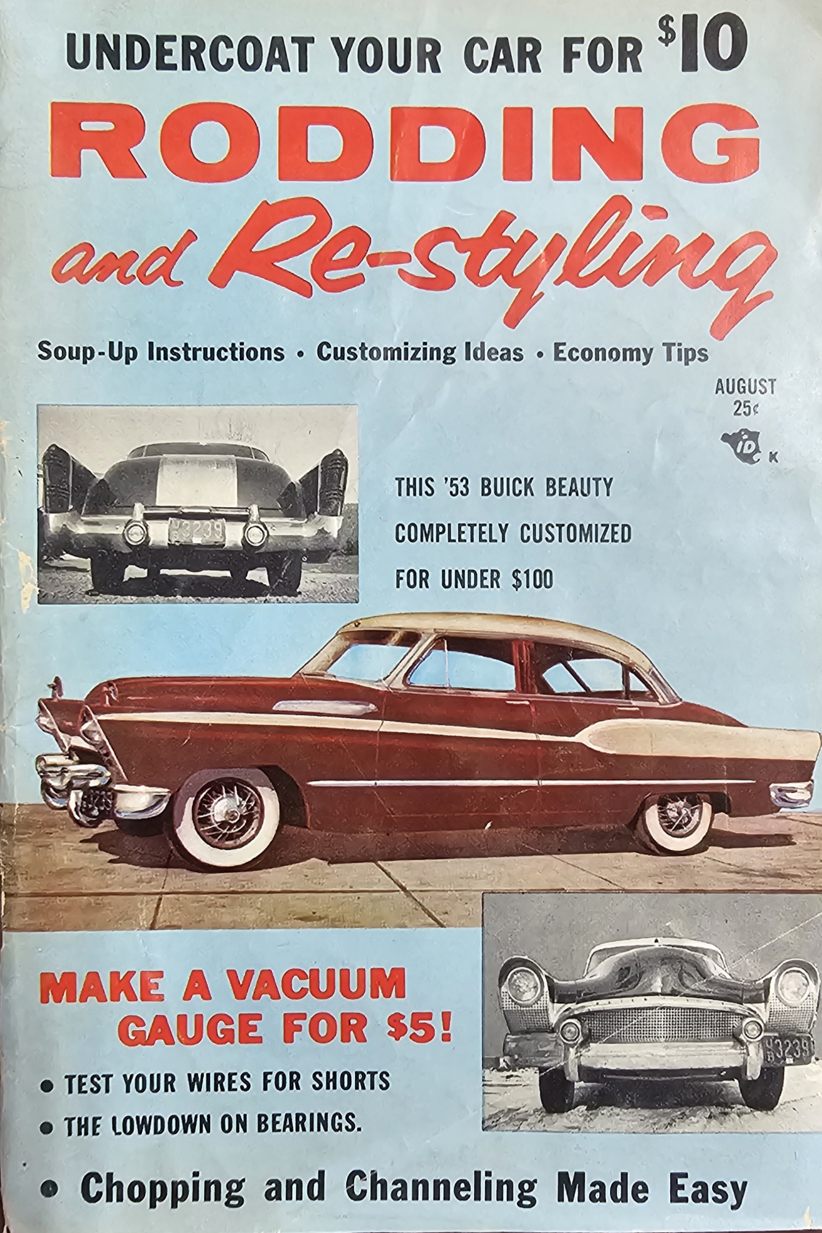 Rodding And Re-styling August 1956 This is an original 25 cent magazine in very good shape. 81 pages of articles on how to do different upgrades to your hot rod, advertising from shops and articles on several custom builds with the owner and builder. Grumps So-Cal.