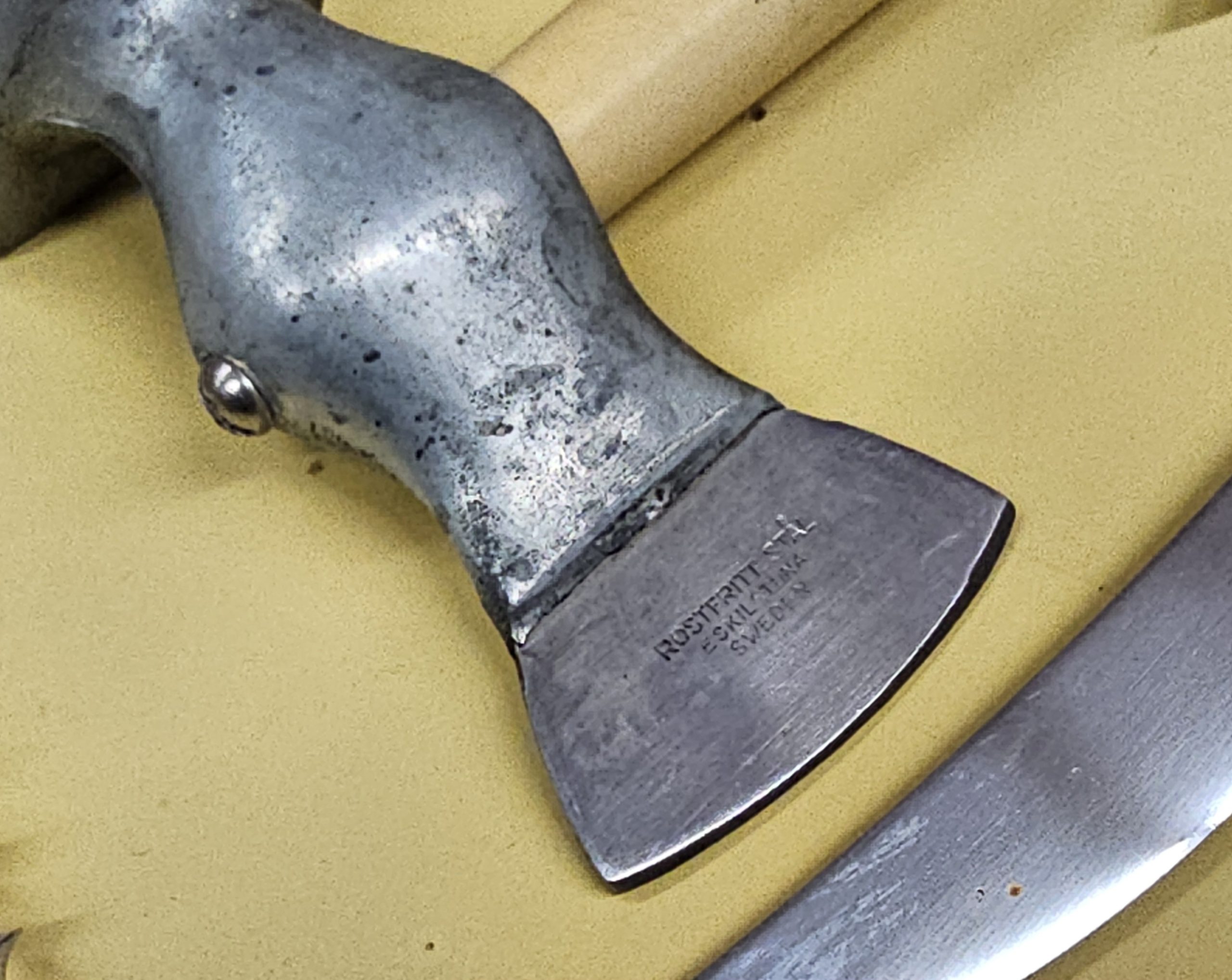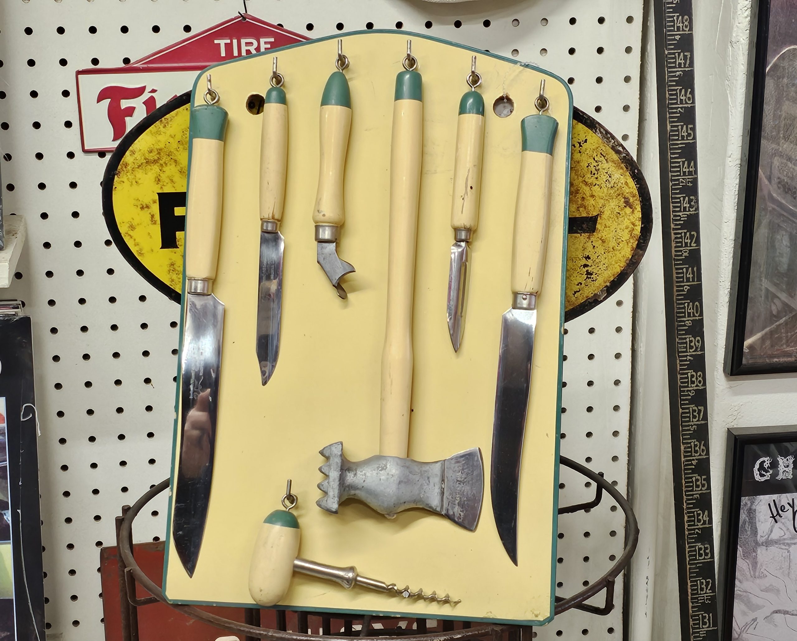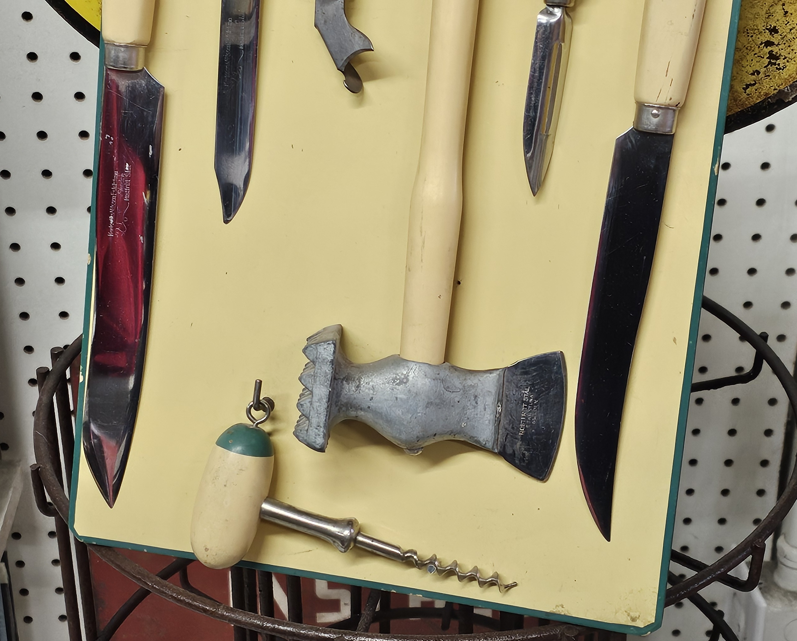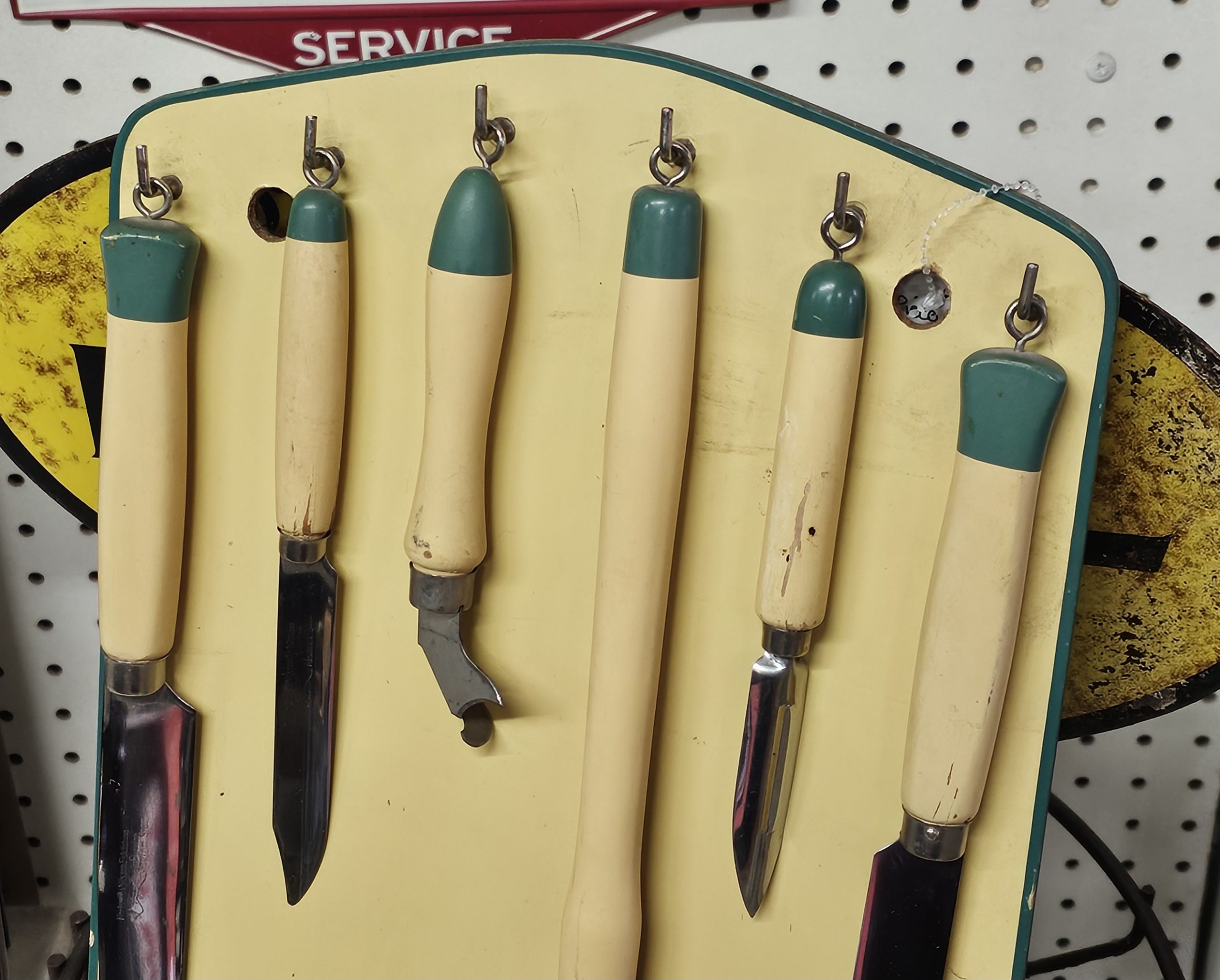 Rostfrit Cream Blue Hanging Cutlery Set Made in Sweden. Stainless 8-piece set, 7 utensils and the handing board to match. 1940s-50s original set. All utensils are matching manufacturer markings, board is not marked but color match. Does show some minor usage, but overall in excellent condition and ready to use in your vintage kitchen.