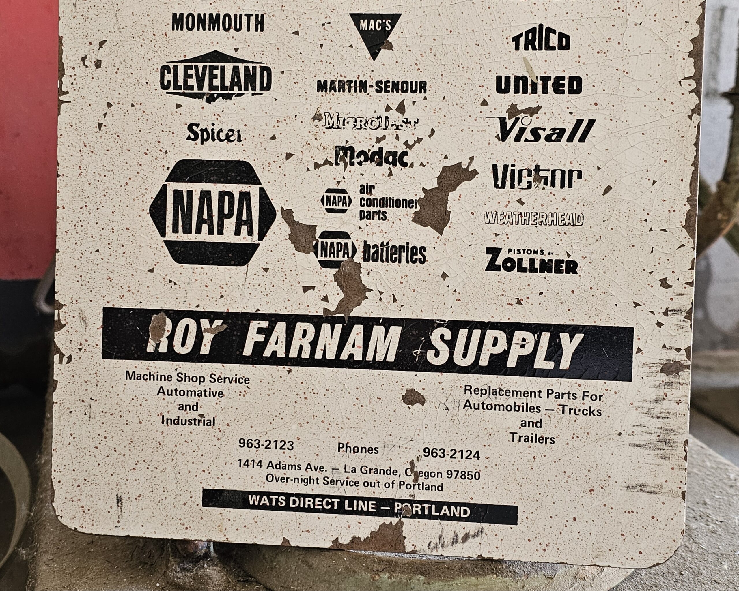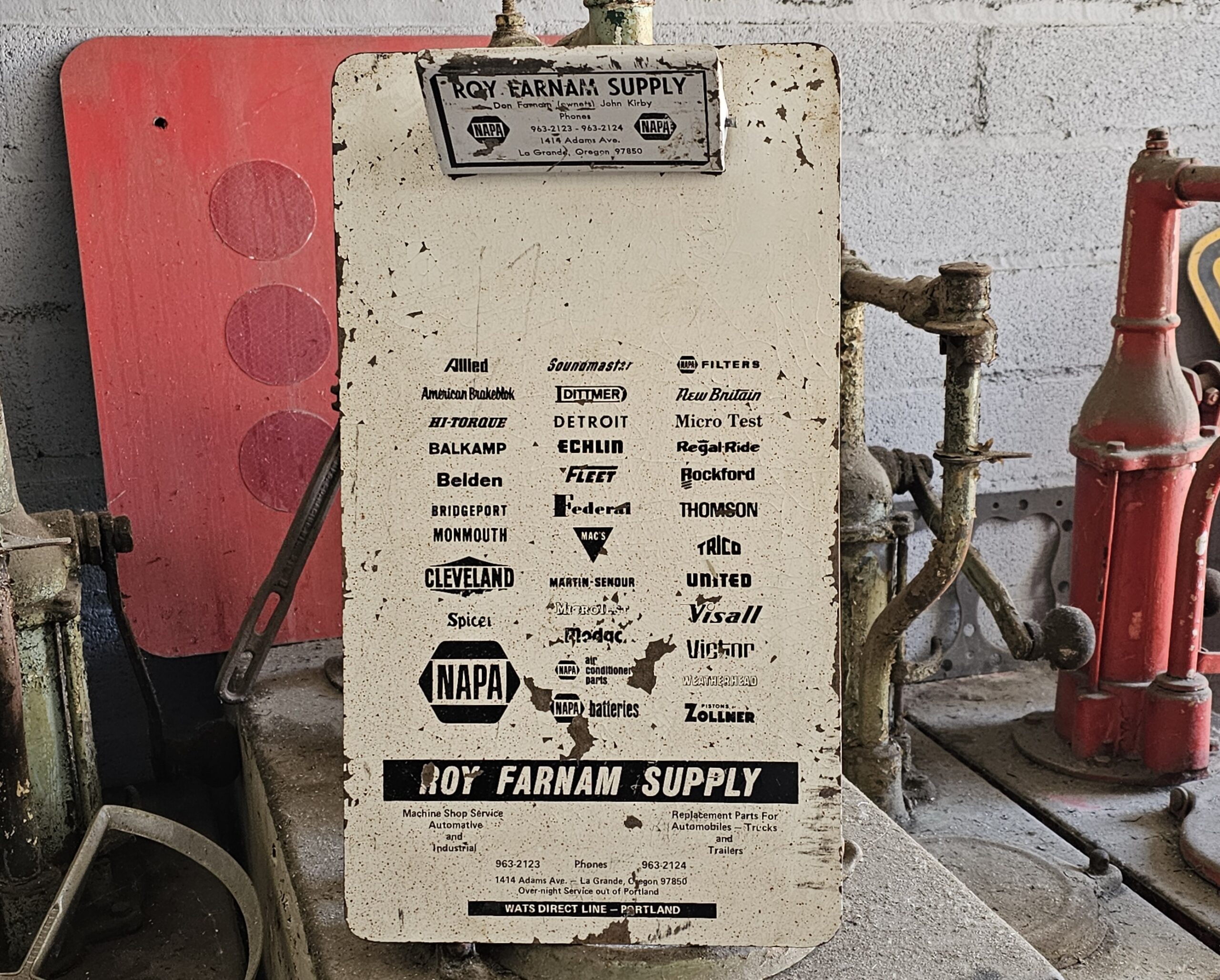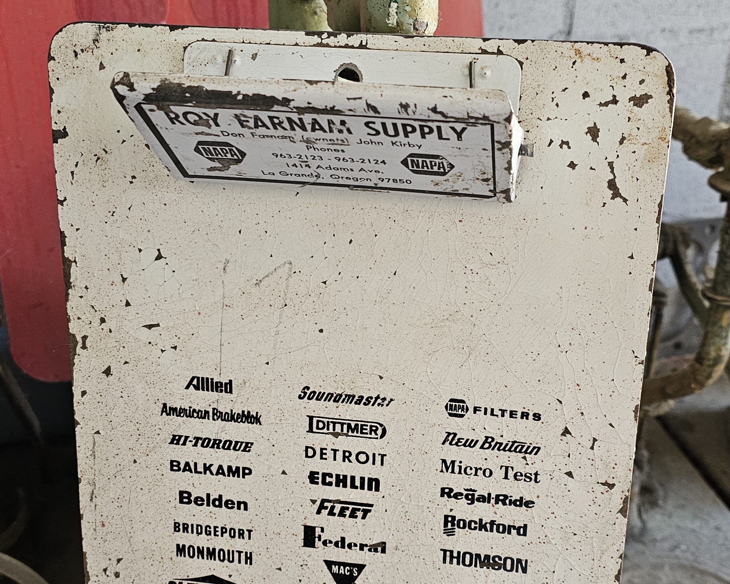 Roy Farnam Supply Clip Board Neat old automotive related clip board. As pictures show, it was used. This advertising clipboard from Roy Farnam Supply, once located at 1414 Adams Ave in La Grande, Oregon, serves as a historical directory of automotive and industrial brands. These types of clip boards were common promotional items distributed by NAPA jobbers to auto repair shops and machine shops throughout the mid-20th century. It features a comprehensive list of period-correct brands carried by the supplier, many of which are still recognizable today. Grumps So-Cal.