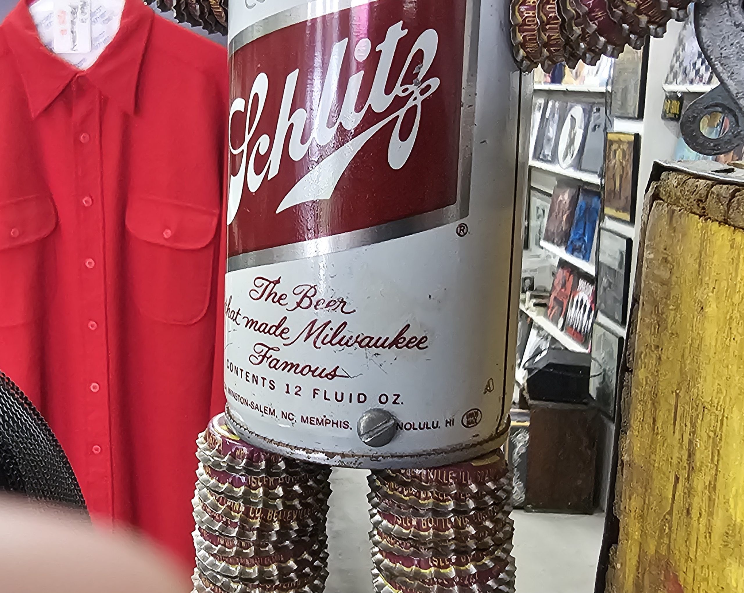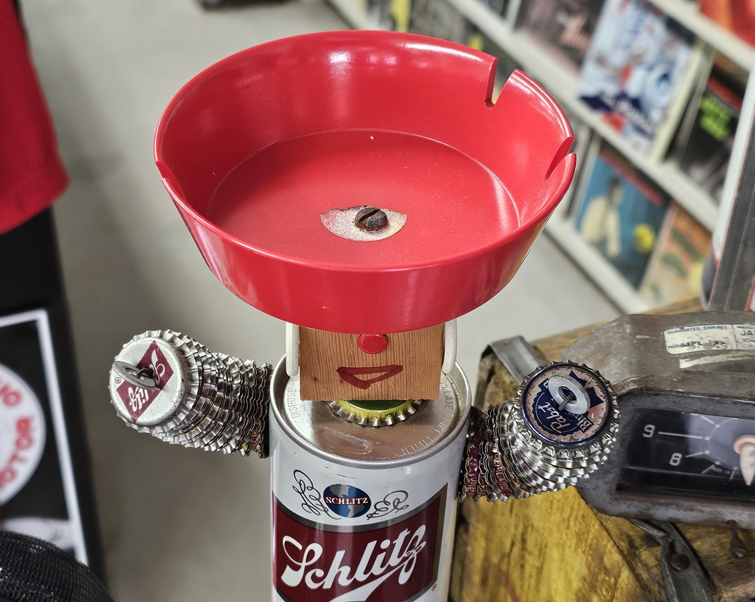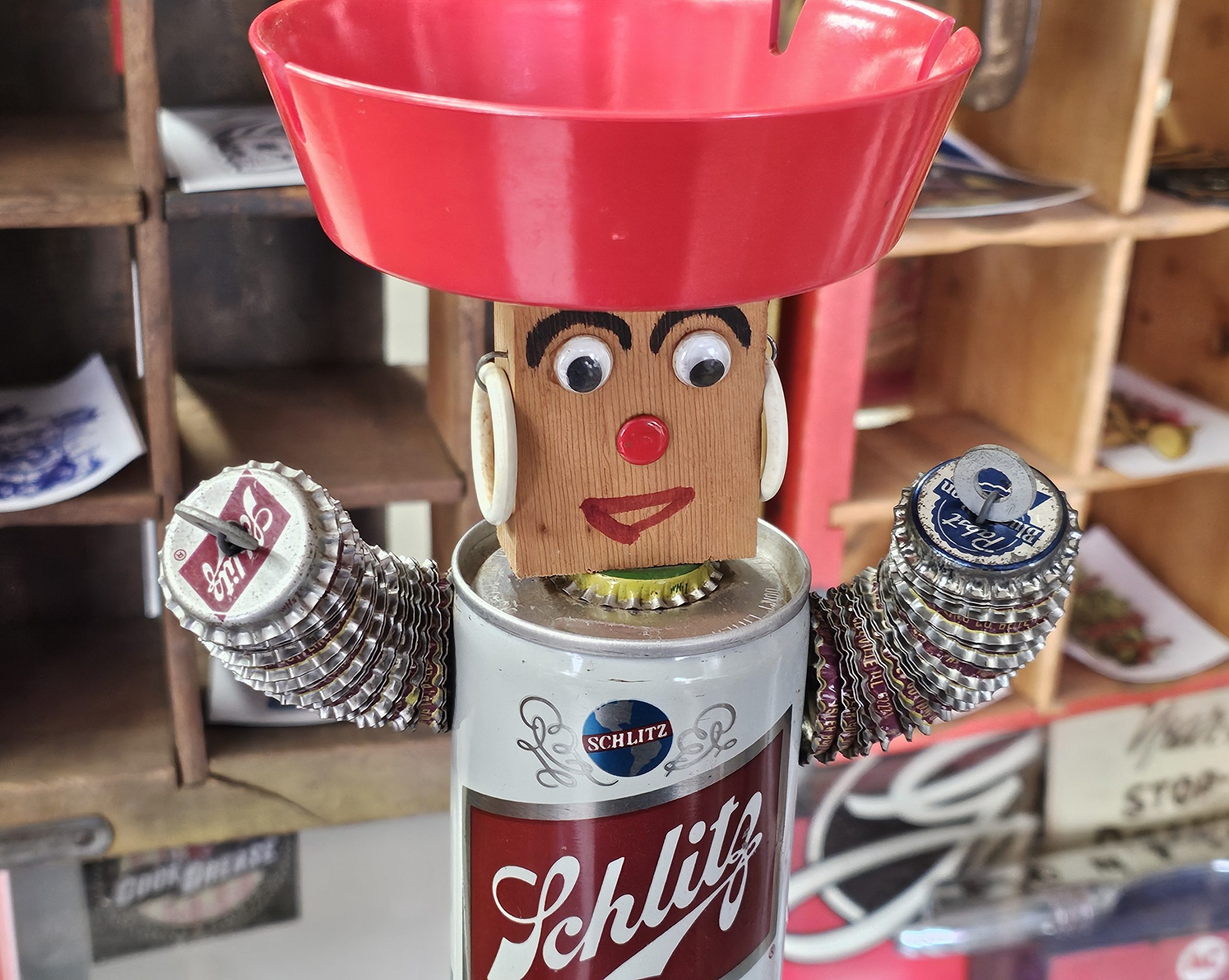 Schlitz Beer Can Bottle Cap Ashtray 1960s folk art ashtray. What makes this one risque, is when you lift the can his little weaner pops out. Made from a 1960s can and several soda and beer bottle caps. Ashtray doesn't look like it's been used, can has small area with sticker residue. Measures about 12 1/2" tall, 6 1/4" wide and 5" deep. Manufactured by The Can Man Co. St. Louis, Mo.
