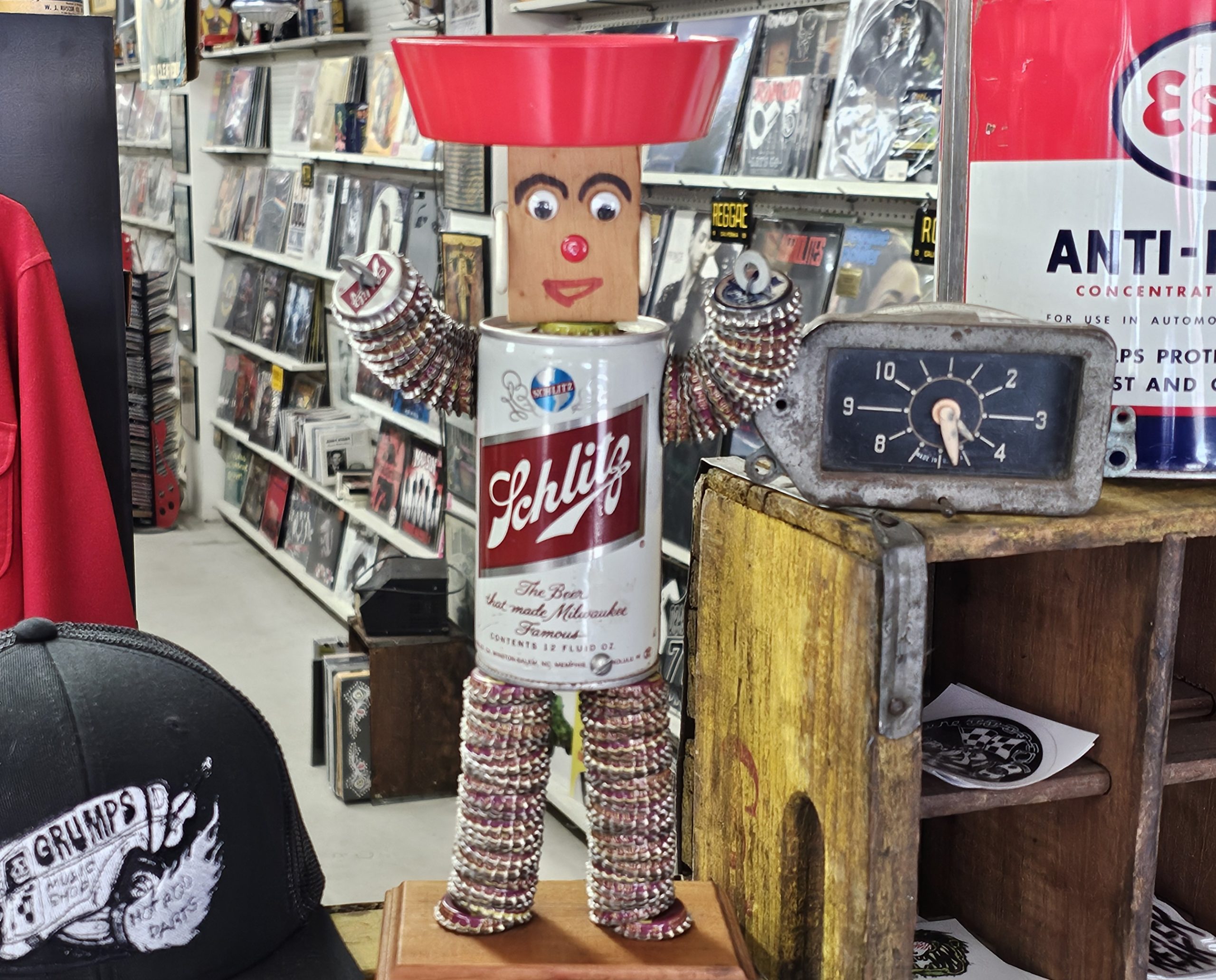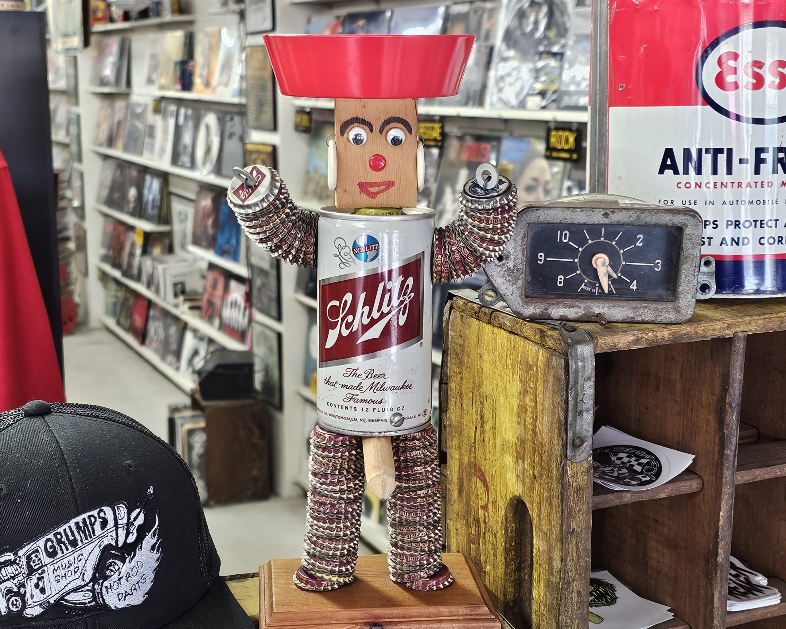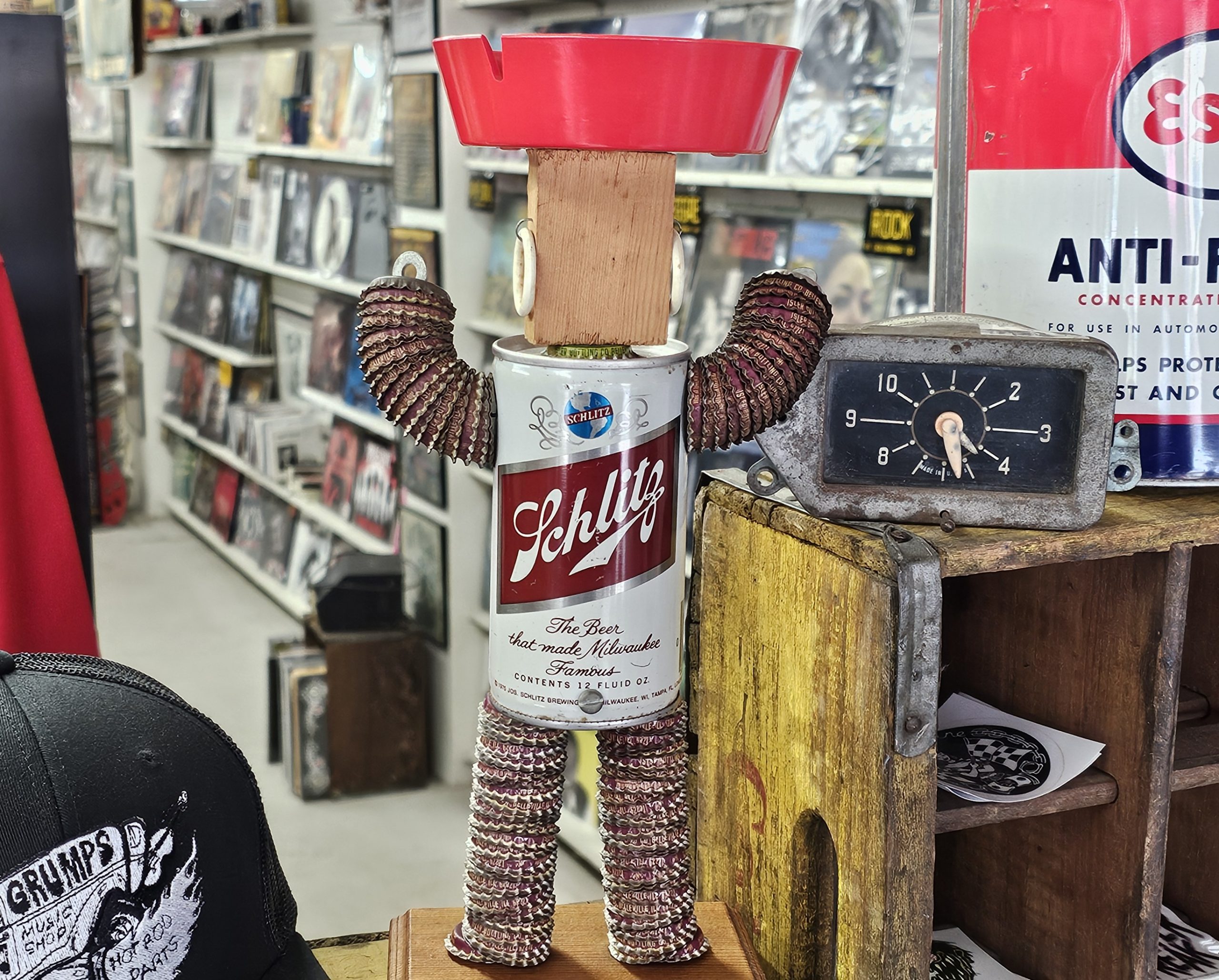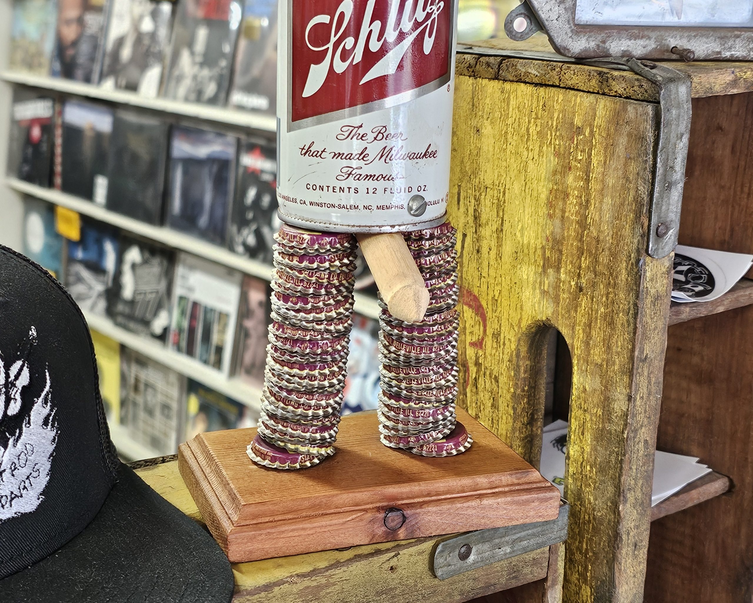 Schlitz Beer Can Bottle Cap Ashtray 1960s folk art ashtray. What makes this one risque, is when you lift the can his little weaner pops out. Made from a 1960s can and several soda and beer bottle caps. Ashtray doesn't look like it's been used, can has small area with sticker residue. Measures about 12 1/2" tall, 6 1/4" wide and 5" deep. Manufactured by The Can Man Co. St. Louis, Mo.