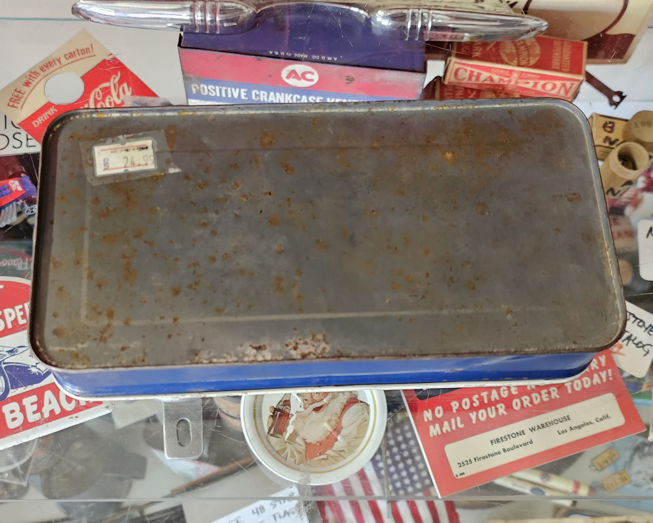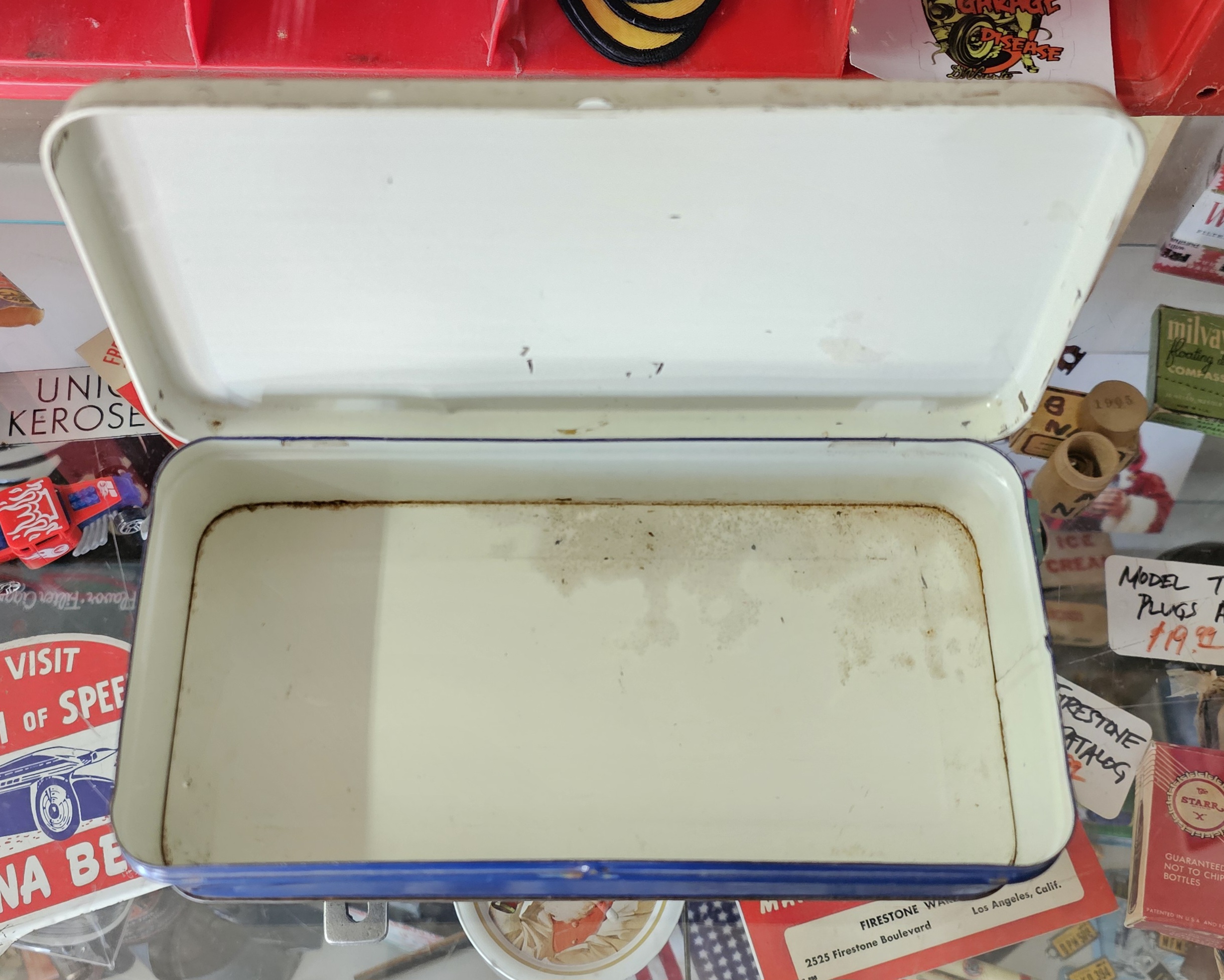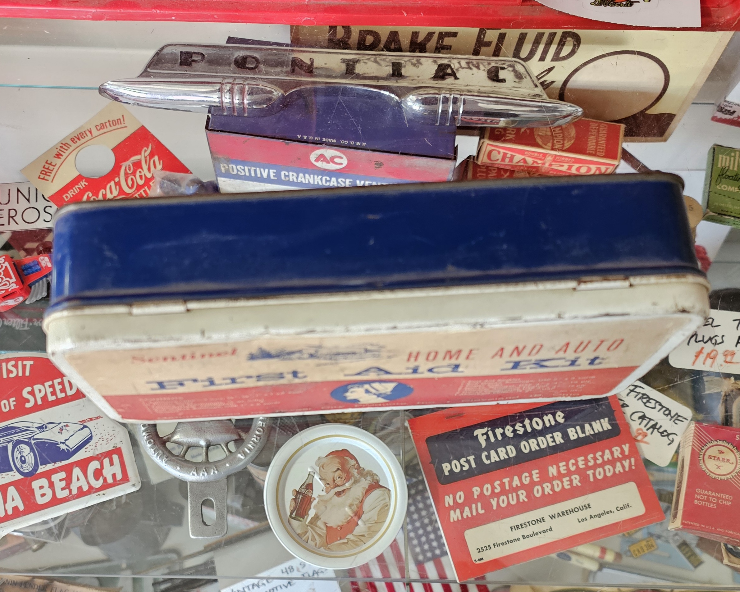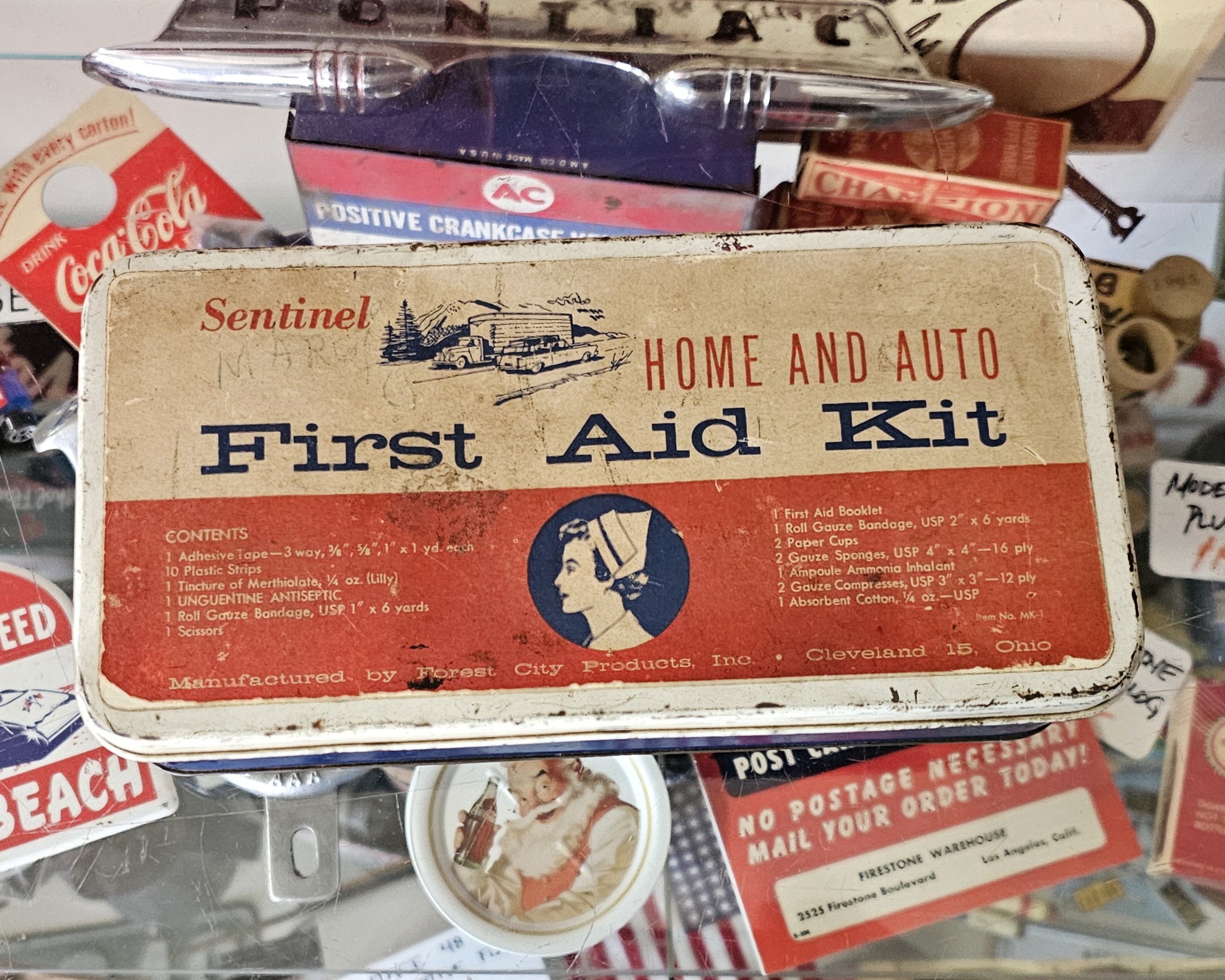 Sentinel Home And Auto First Aid Kit  This is an old original tin with a paper decal label with neat graphics.  Probably mid-late 1950s.  It is empty, but always cool addition to any old ride, vintage garage or home.  Was manufactured by Forest City Products, Inc. Cleveland, Ohio.