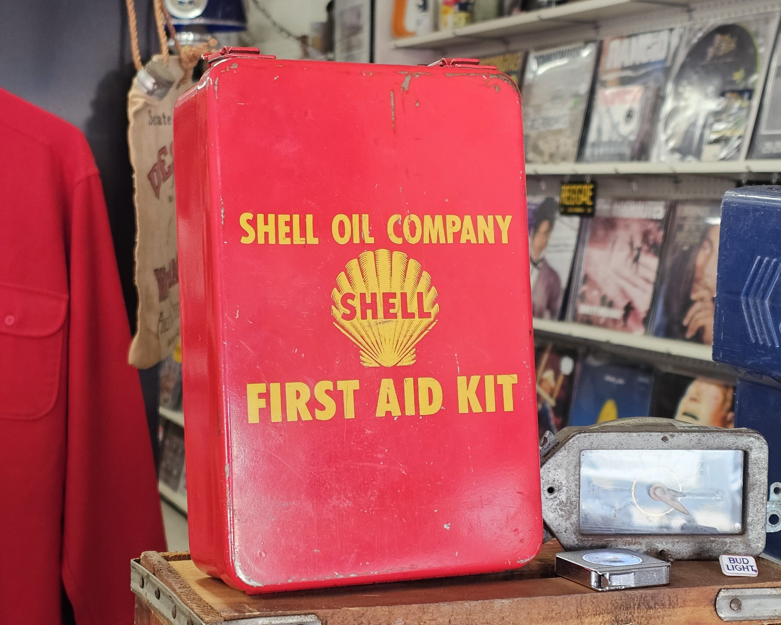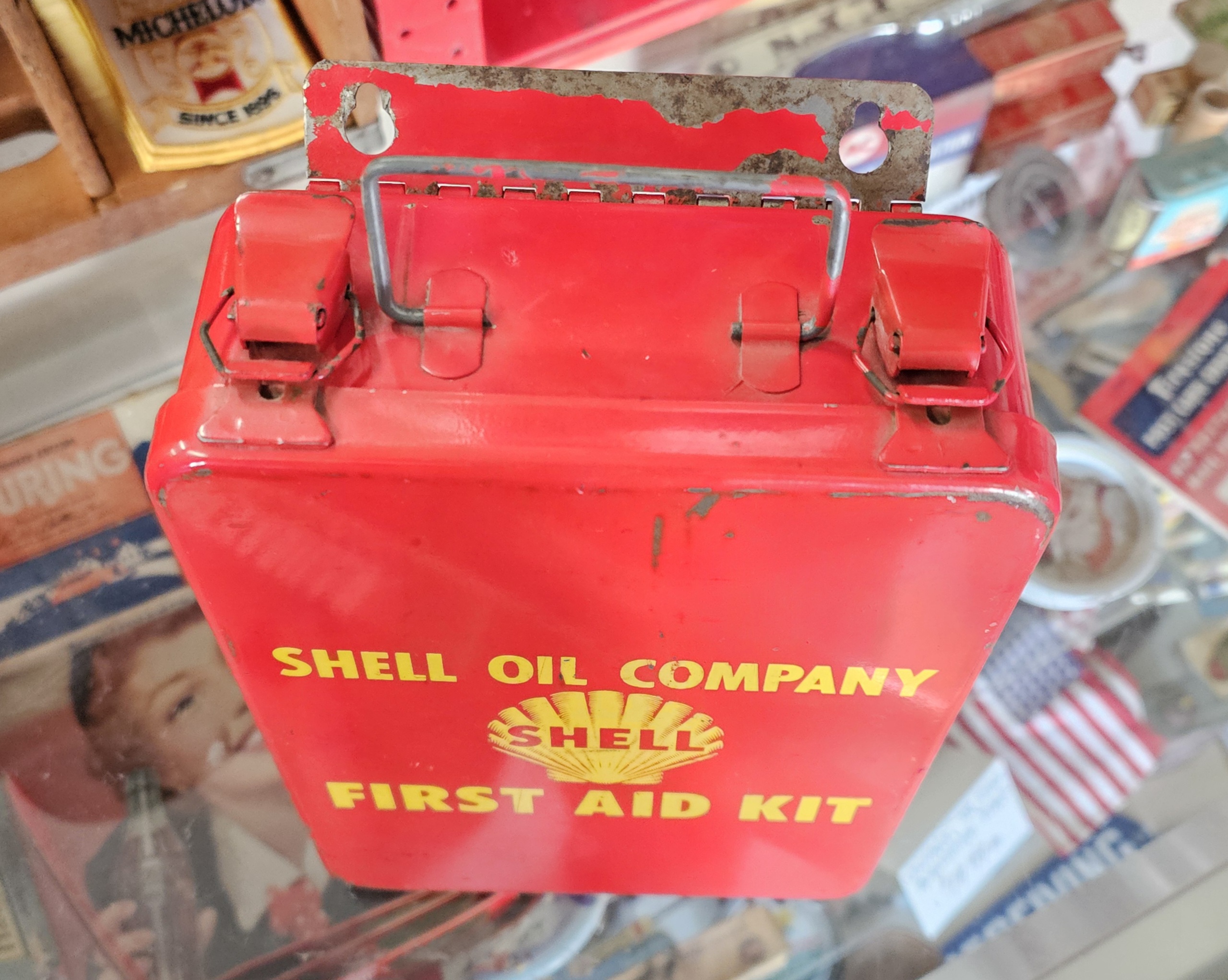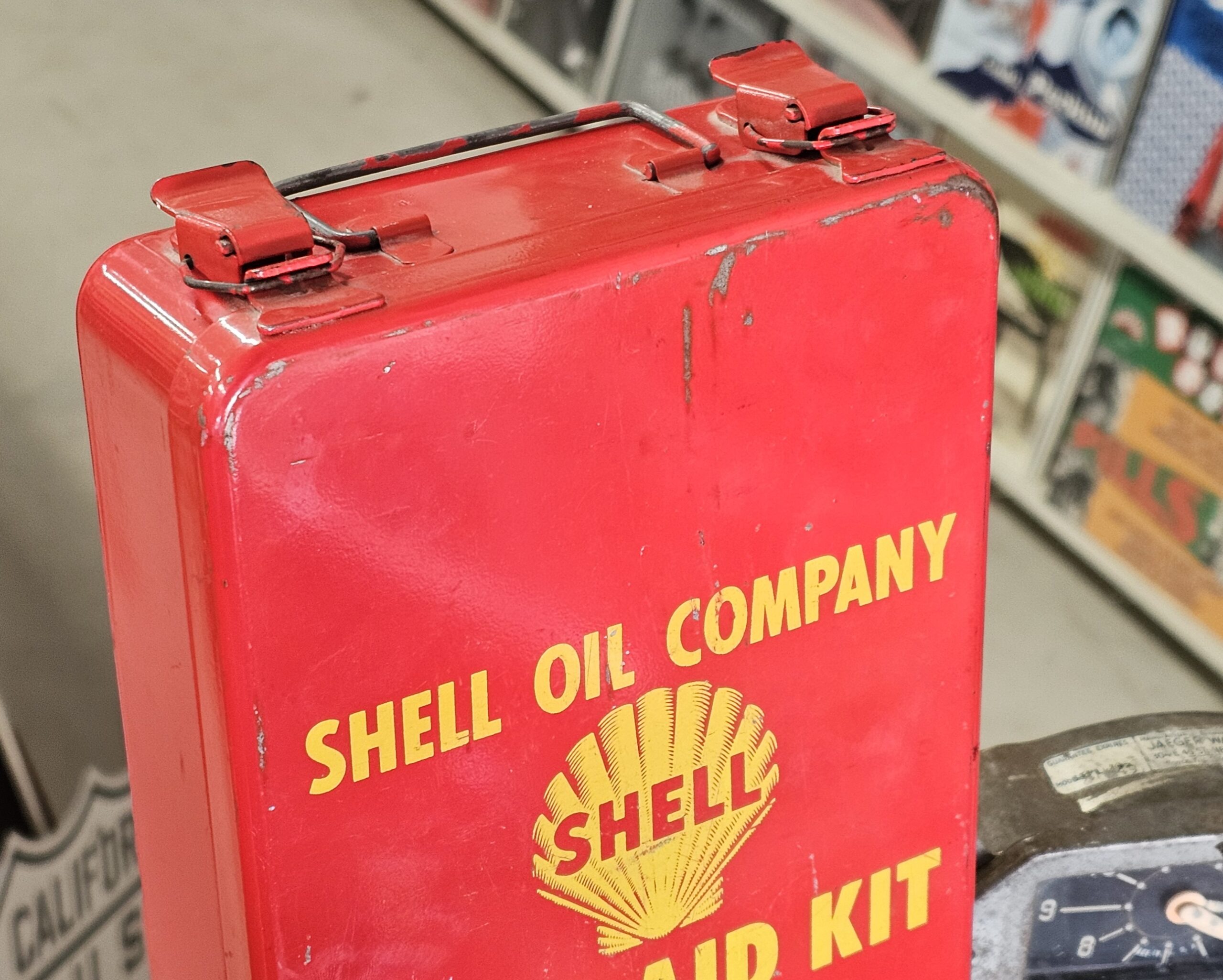 Shell Oil Company First Aid Kit Heavy gauge metal kit believed to be from the late 1950s. This is determined by the design of the Shell pectin printed on the lid. The box is in fantastic condition, minimal scratches. Might never see one this nice, seems like most of contents still there. Grumps Collectibles So-Cal.