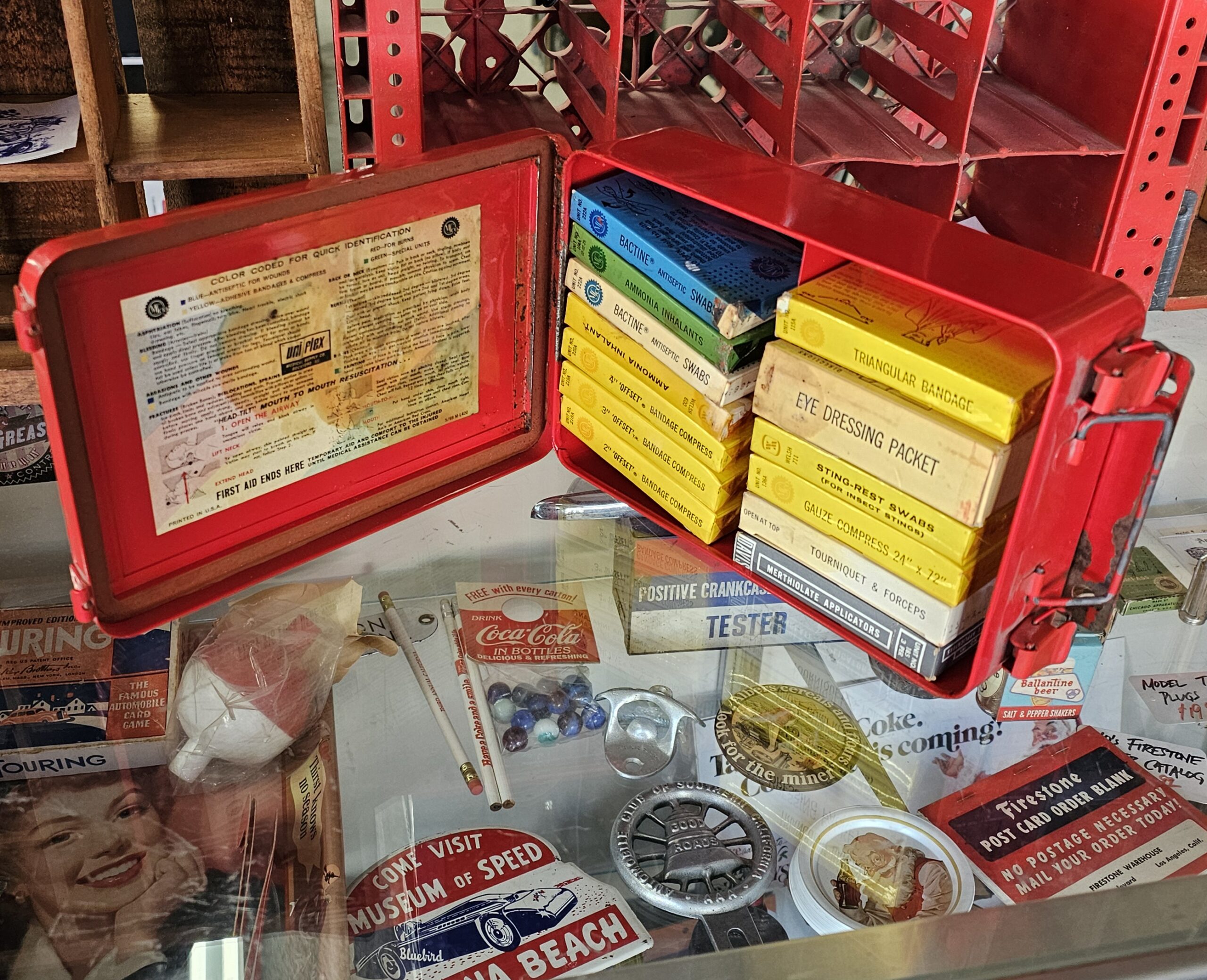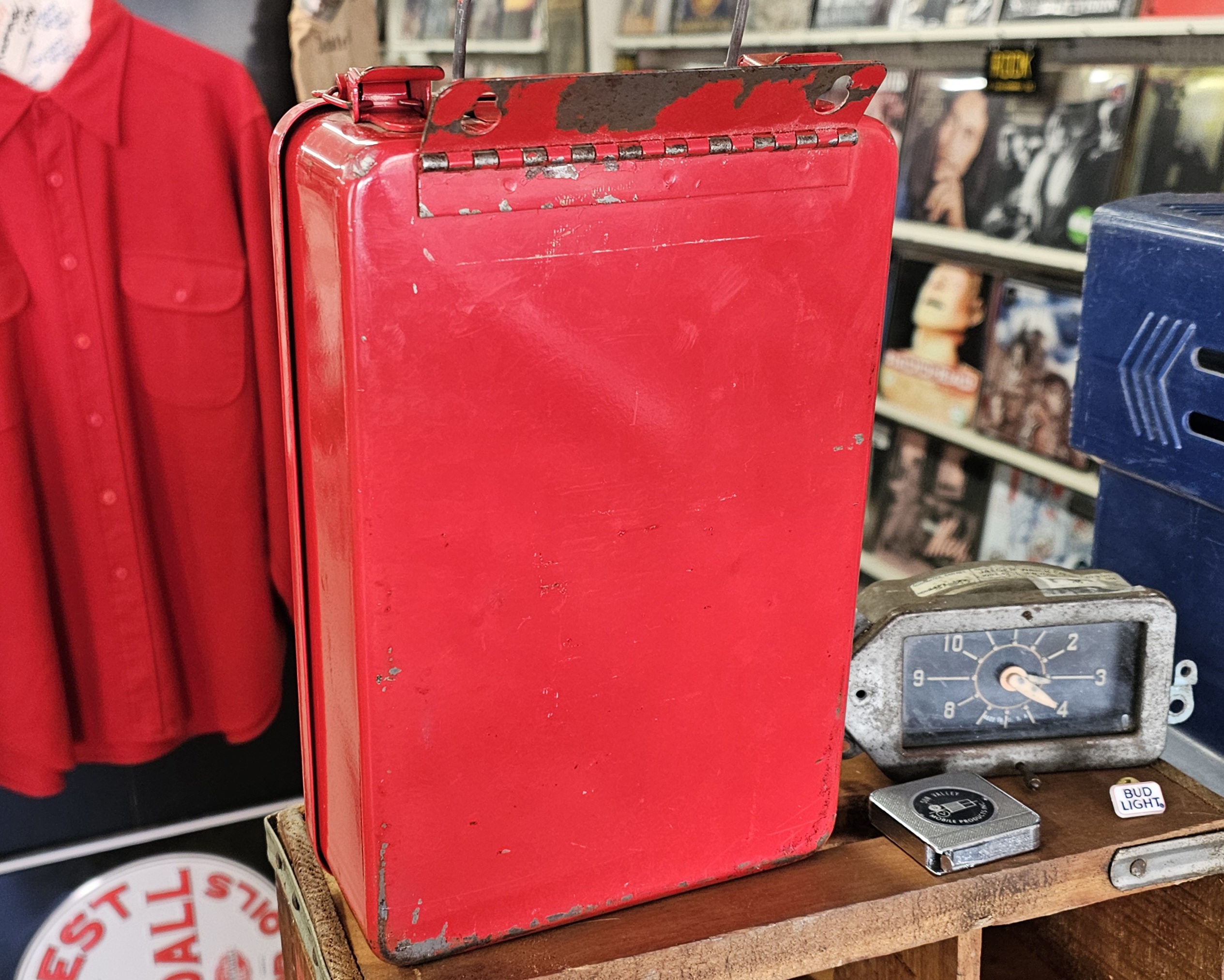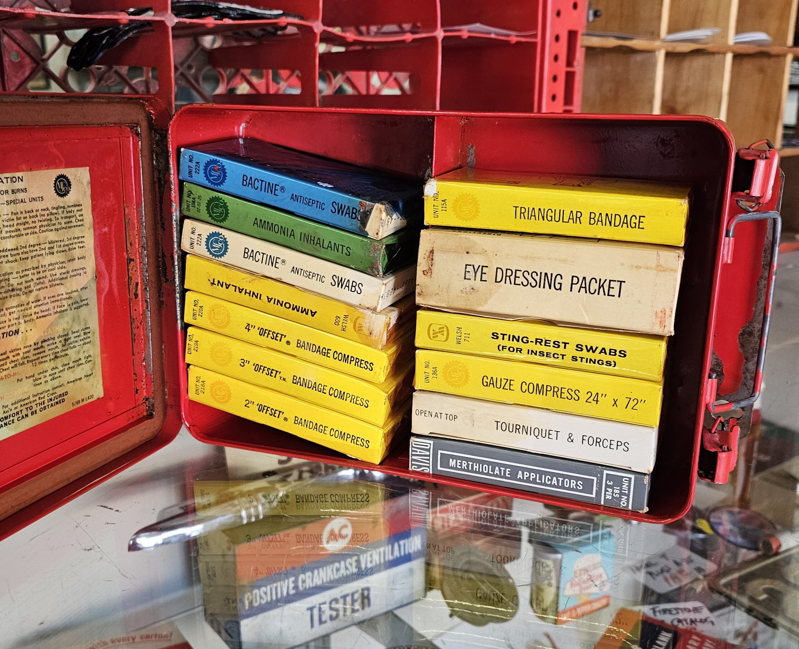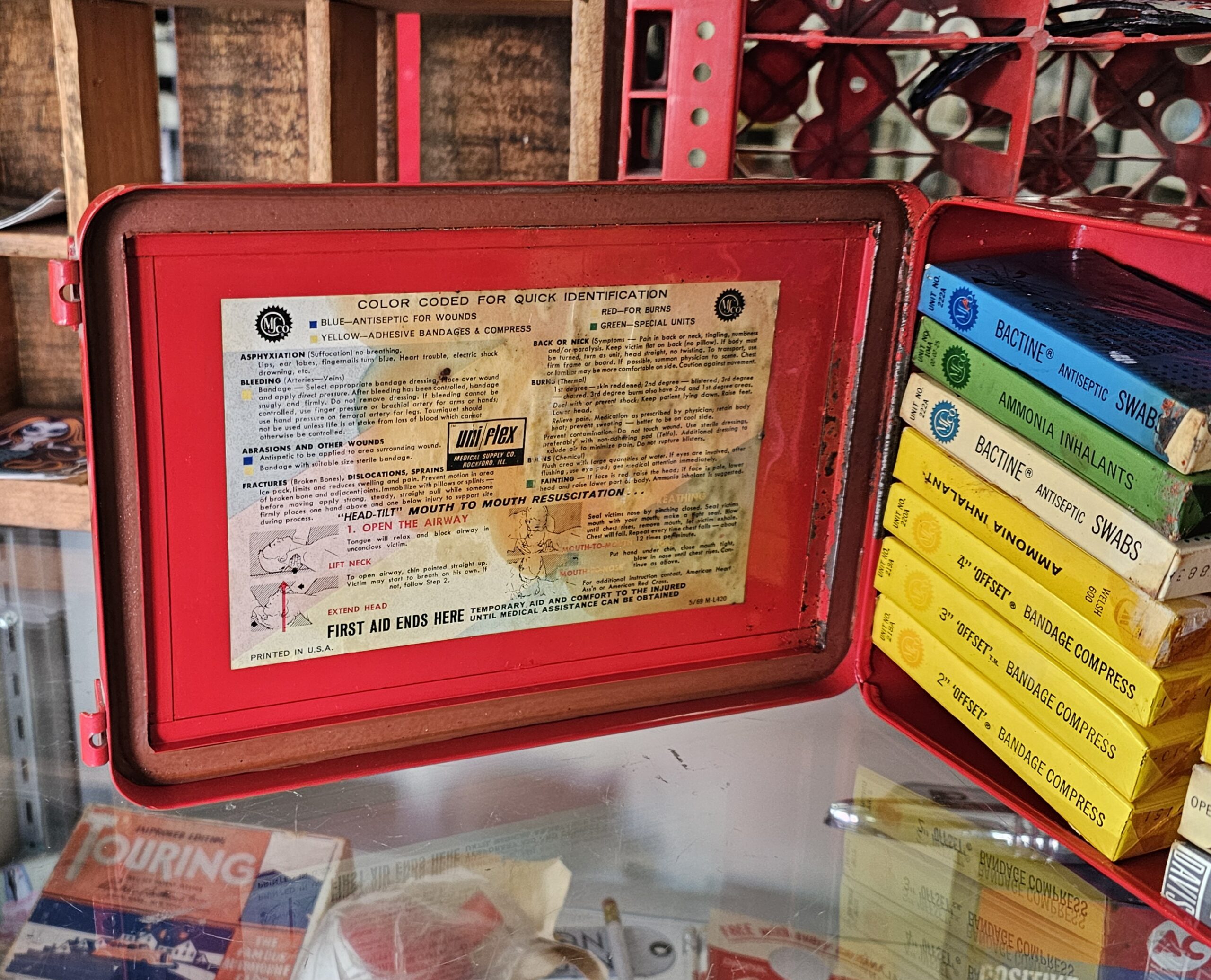 Shell Oil Company First Aid Kit Heavy gauge metal kit believed to be from the late 1950s. This is determined by the design of the Shell pectin printed on the lid. The box is in fantastic condition, minimal scratches. Might never see one this nice, seems like most of contents still there. Grumps Collectibles So-Cal.