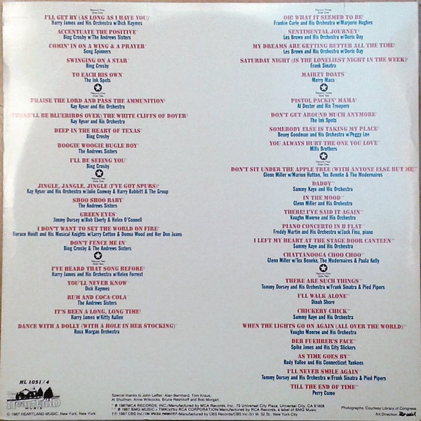 Stage Door Canteen  Vinyl, 4-LP.  Heartland Music HL 1051/4, 1987.  In original plastic, cover is very good+ with a small bend at top right and bottom left and all records are excellent/near mint.  With 1000's of artists from now and older available in new & used along with combined freight, you can save and grow your collection with Grumps.  Go ahead, make your ears happy.  Grumps Music So-Cal.Grading For Used Music Items