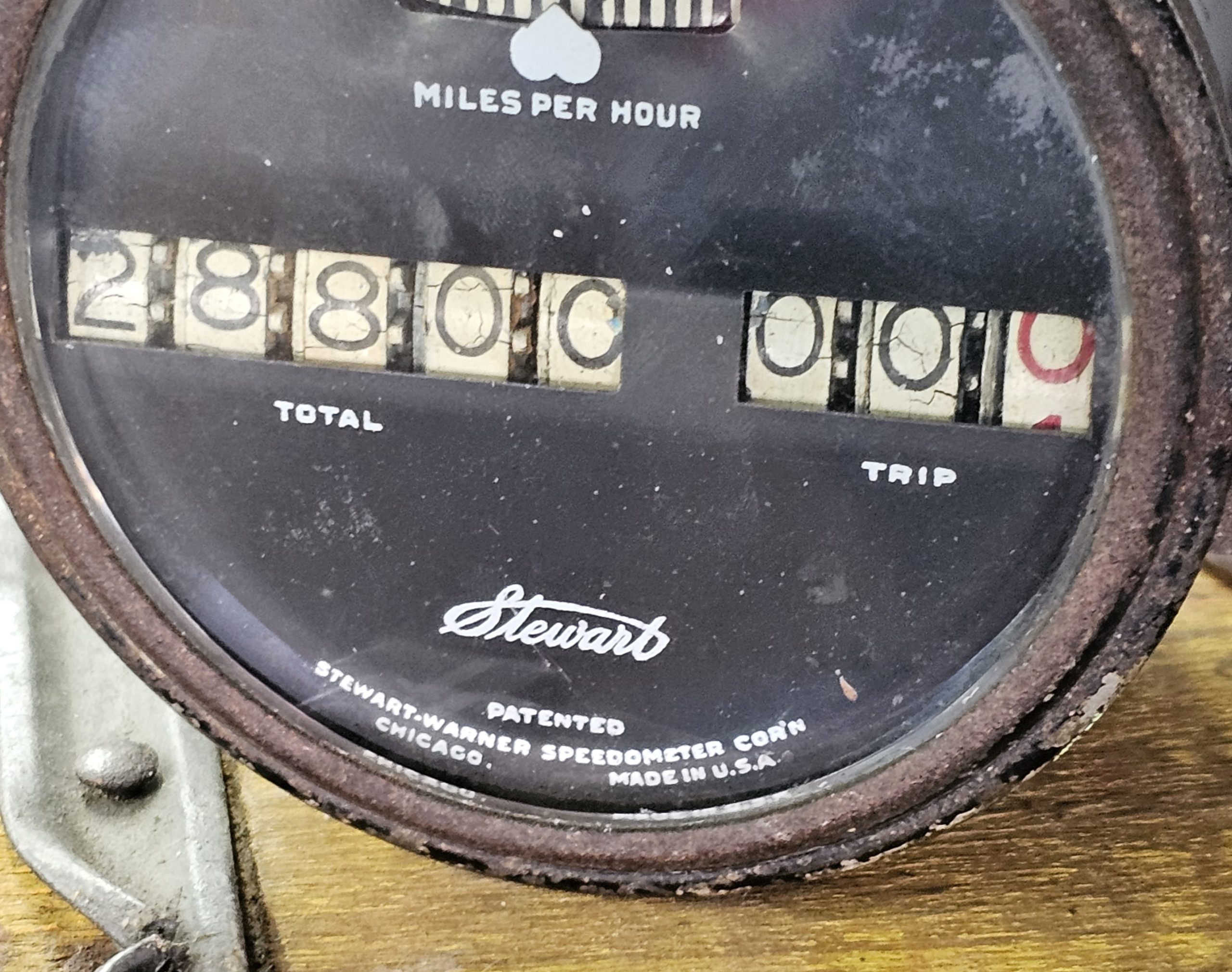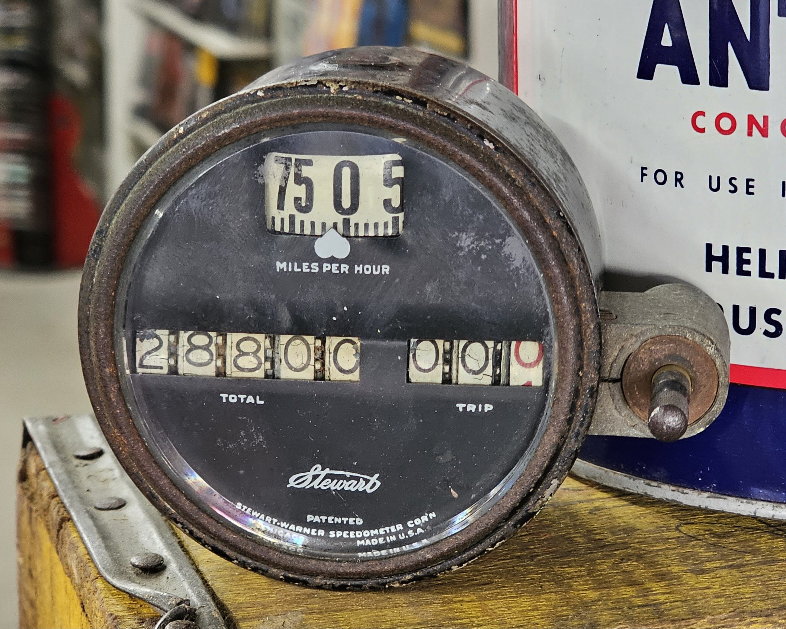 Stewart-Warner Speedometer With Trip Has part number 1137-7 on back. This is a super neat 80 M.P.H. round face original 1920s-early 1940s gauge. Speedometer bounces freely and trip button pushes easily. Metal body is nice, glass front is perfect. Perfect addition to any old jalopy. Measures 3 1/4" round.