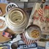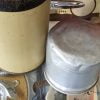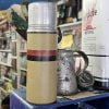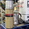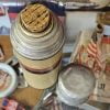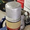 Thermos Tan Red Black This is an early Thermos brand, believe to be late 1940s. Has original cork stopper, and original aluminum lid does have some denting. Neat piece ready to use daily or display in your vintage home or trailer. No need for imported trash when originals are around.