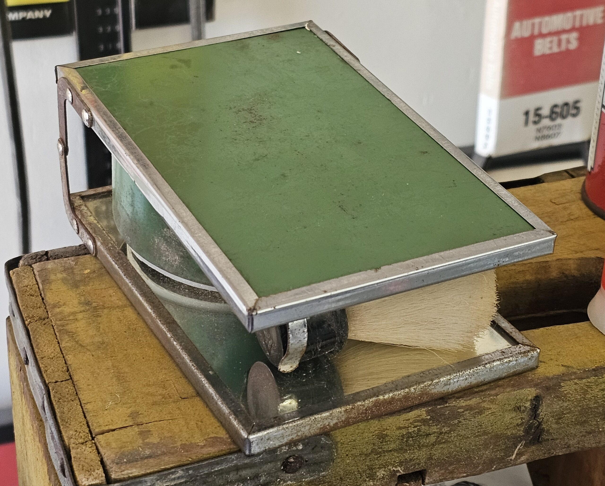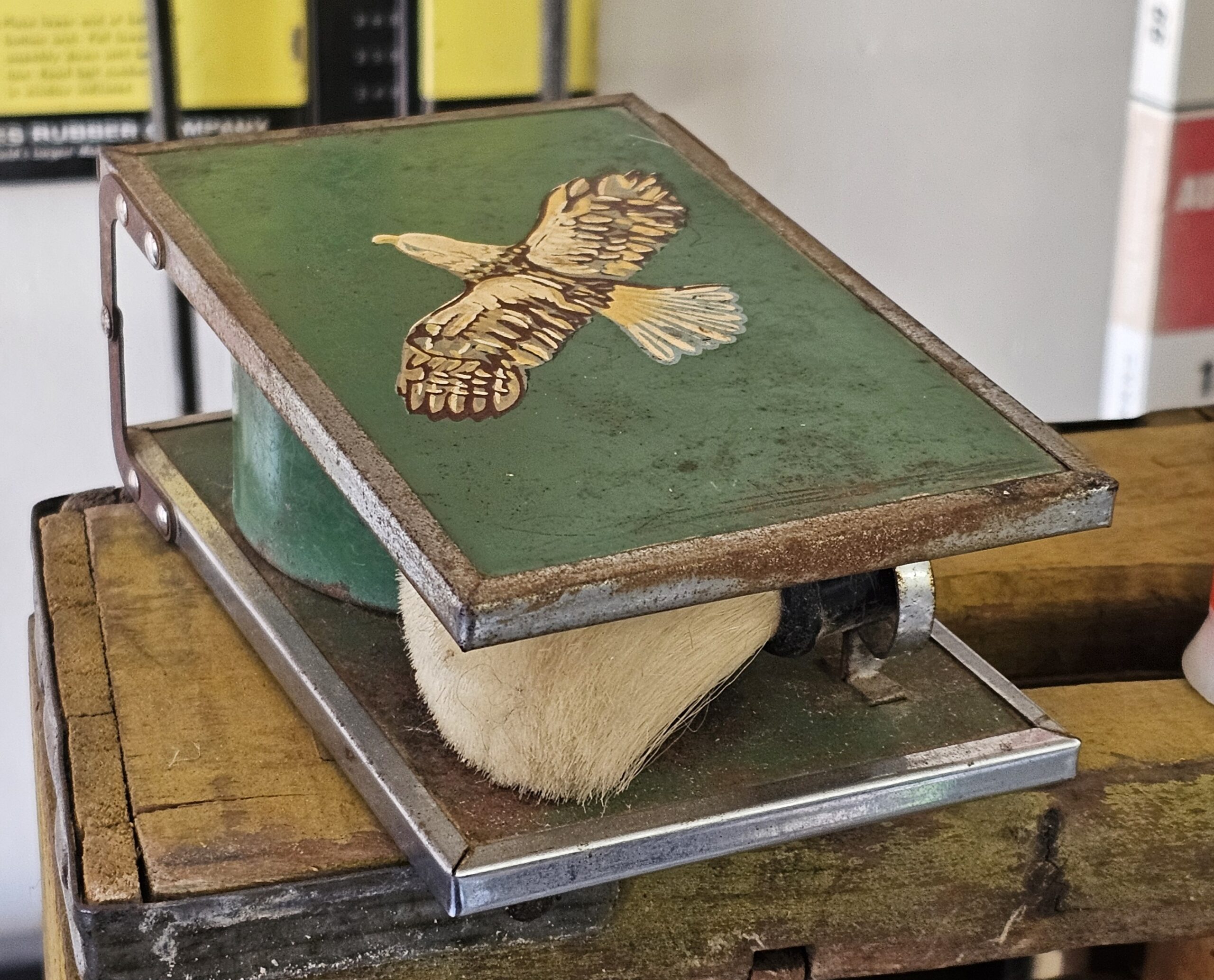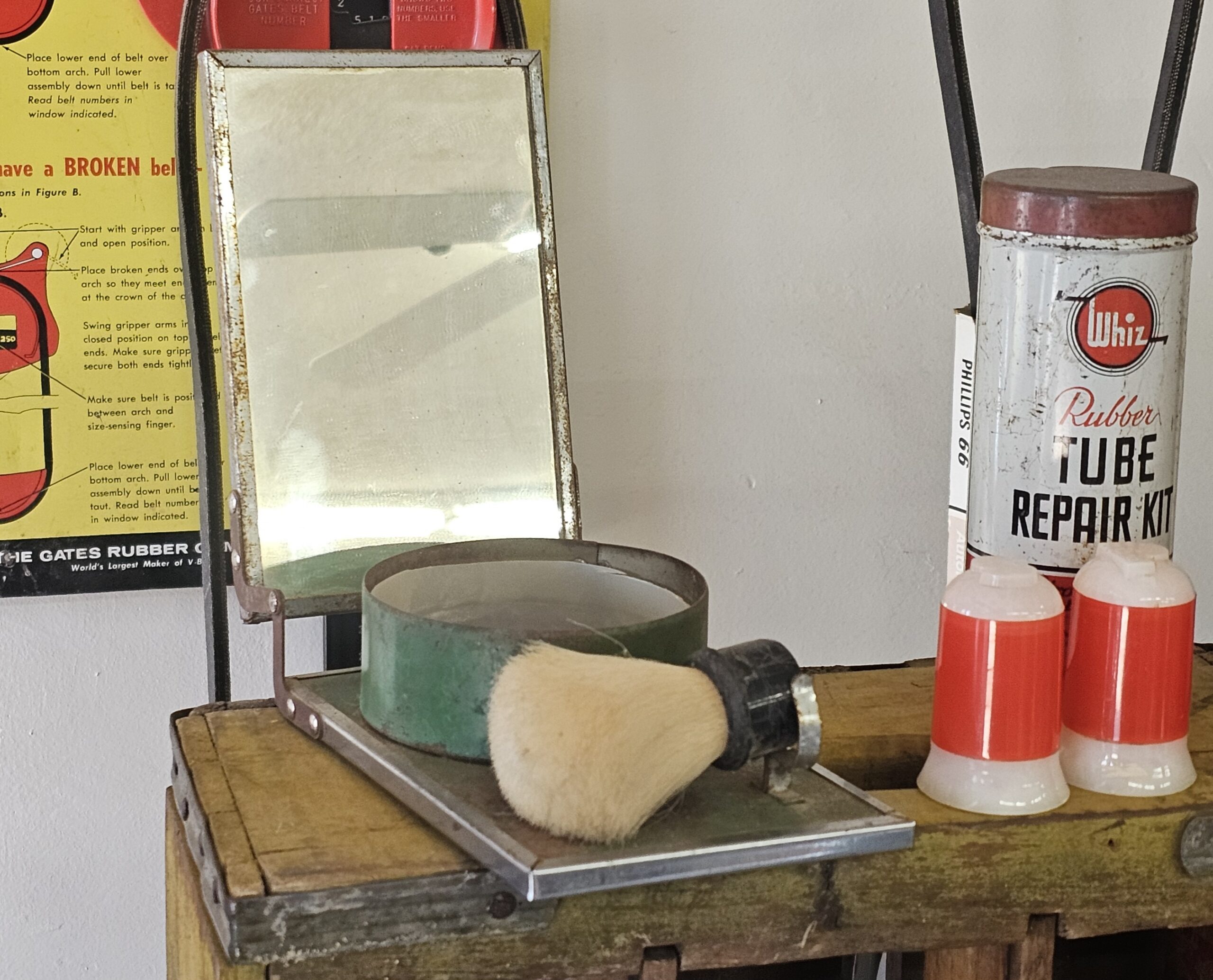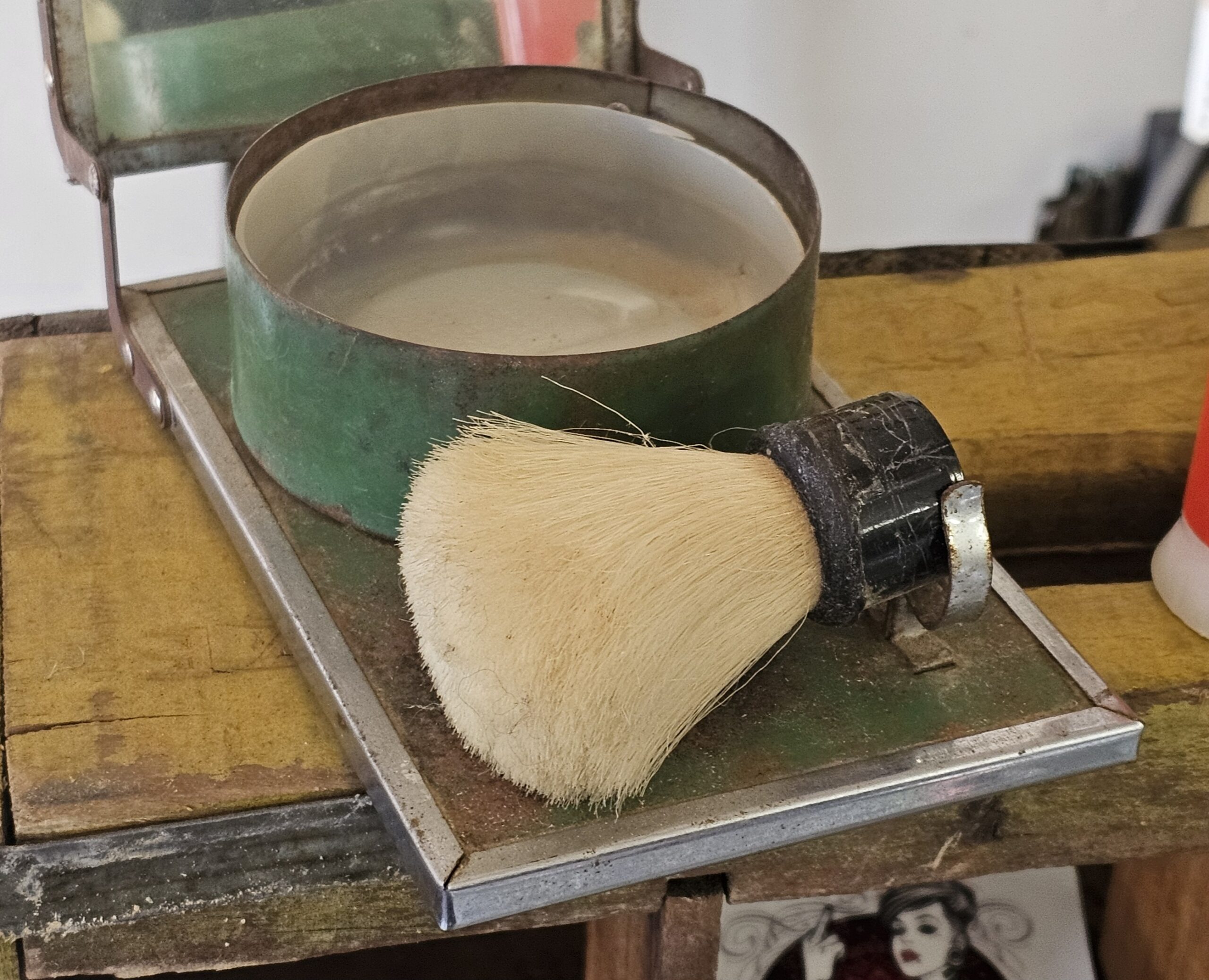 Travel Shave Kit Folding This is an original late 1930s-1940s set. Has eagle painted on top. Opens up to display mirror, brush and cream holder. Feel free to use the item, or use it to add great decor to any bathroom. Far better than using modern imported garbage. Grumps Collectibles.