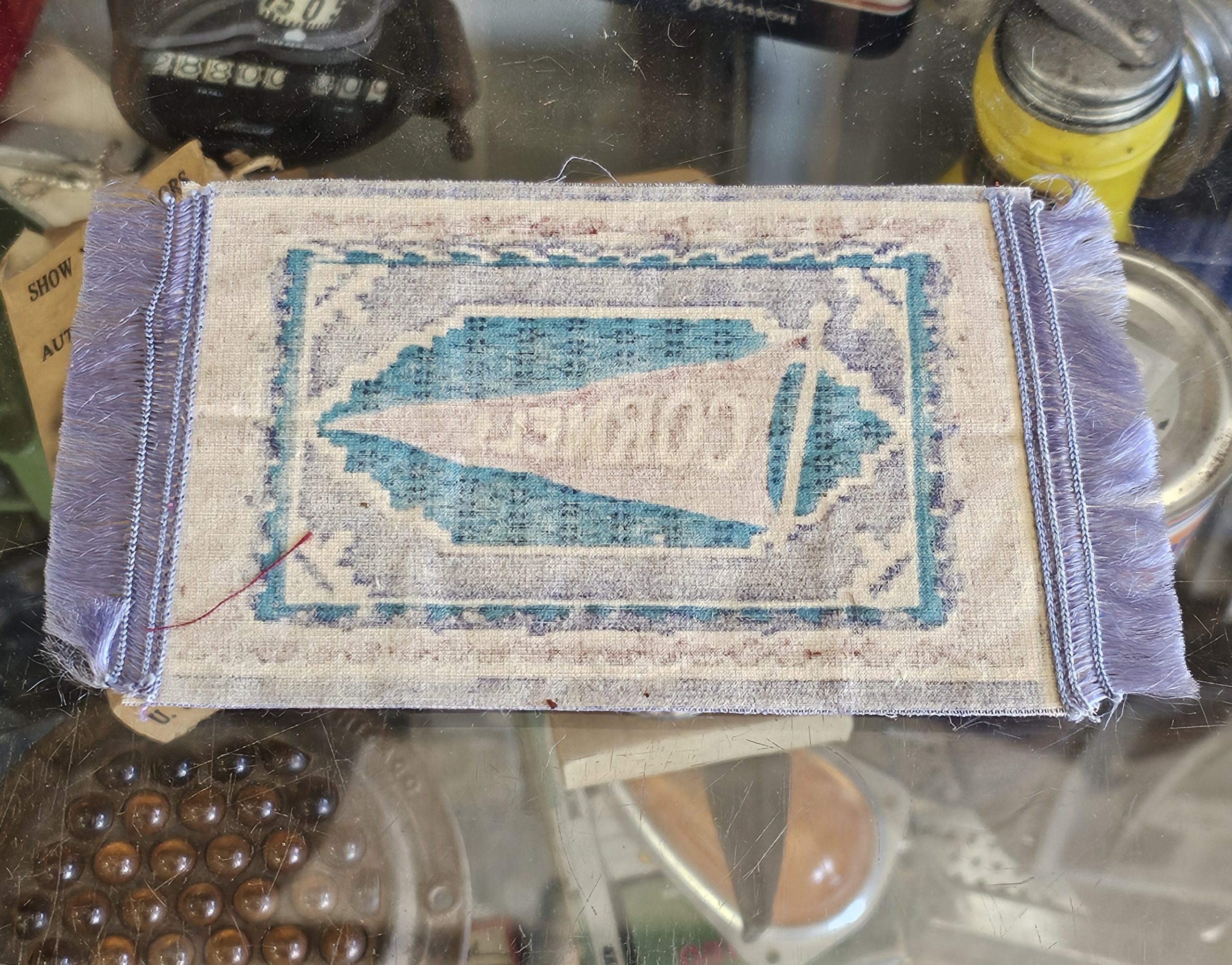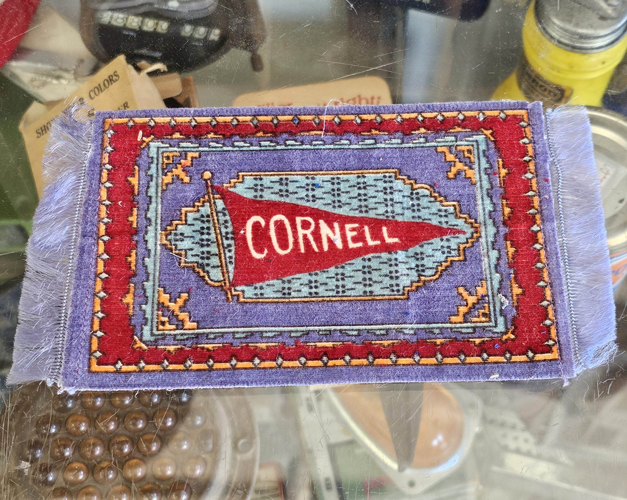 University Of Cornell Tobacco Felt Rug Measures 7" X 4". Tobacco felts, also known as tobacco rugs, were small pieces of fabric given away by tobacco companies as incentive for buying their product. These small pieces of fabric were often used for quilts and pillows. Felts were replaced by coupons around 1916.