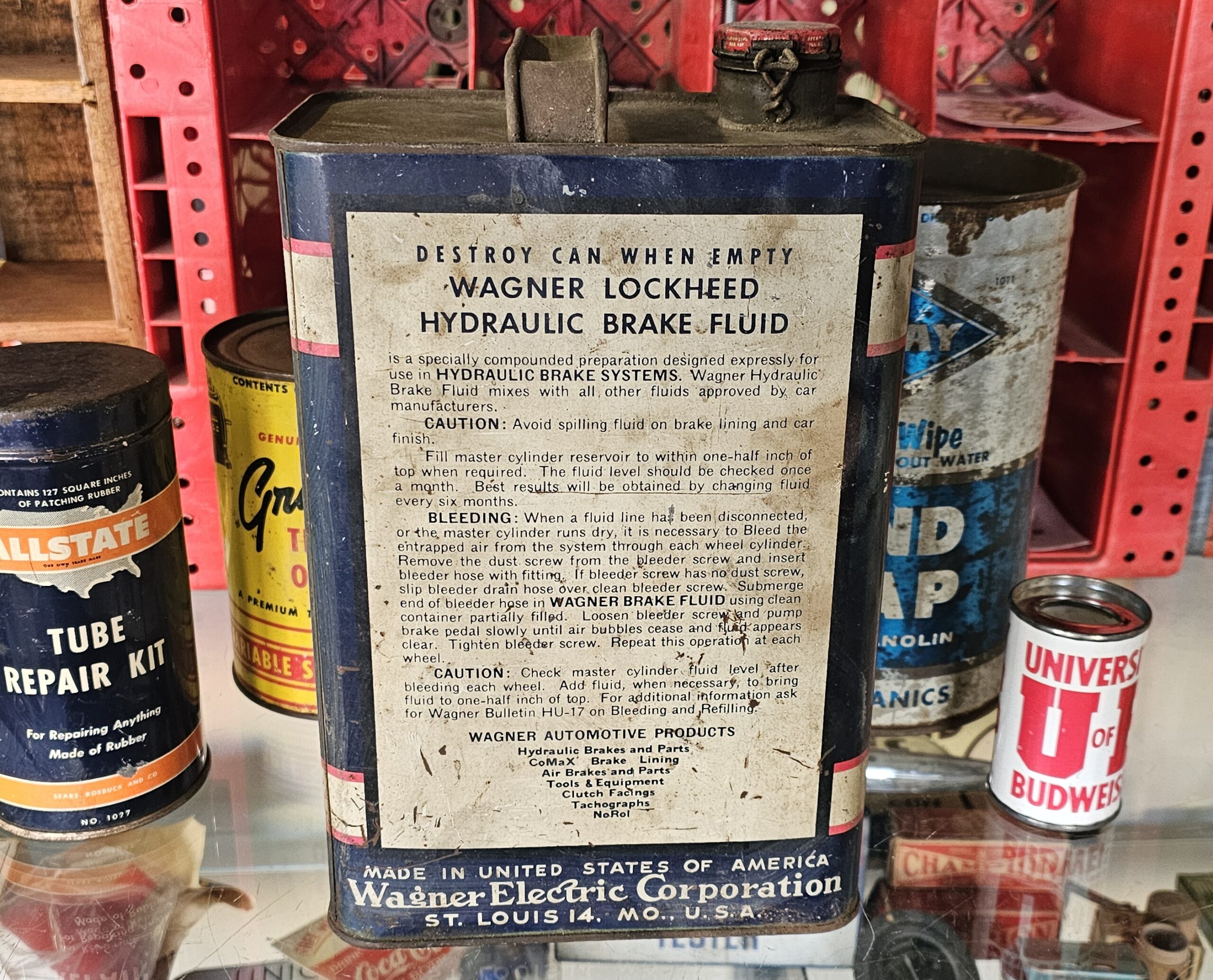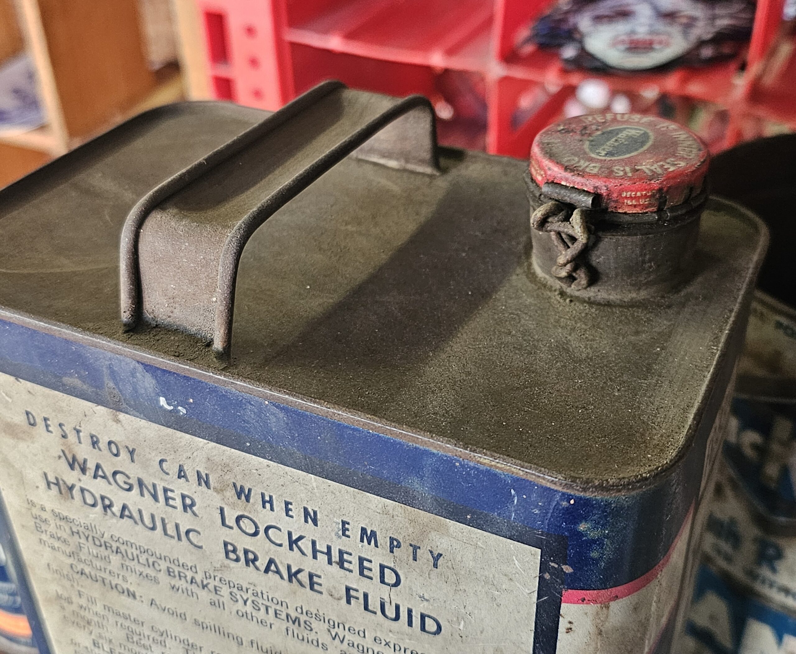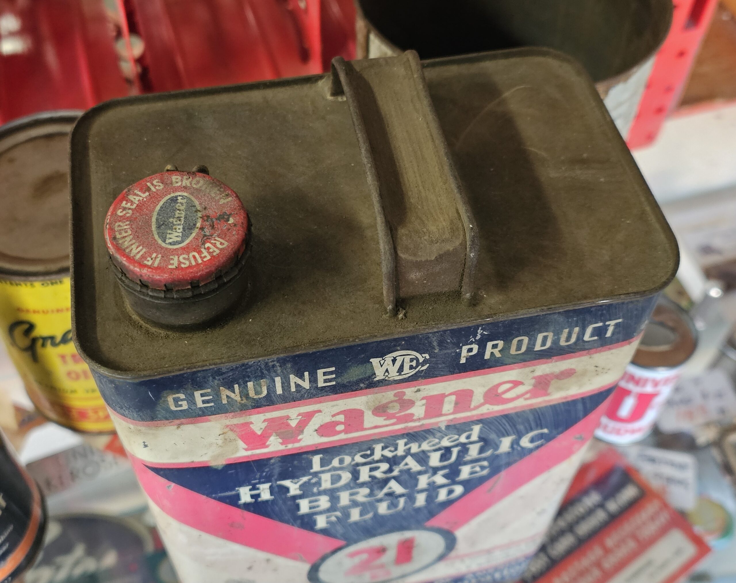 Wagner Lockheed Brake Fluid Can Gallon This is an early version as it does not have a twist style cap, but a bail version. Shows age, but no dents and minimal scratching. ~Half full of original product. Place as vintage décor for your shop or garage. Keep the past alive with original goodies.