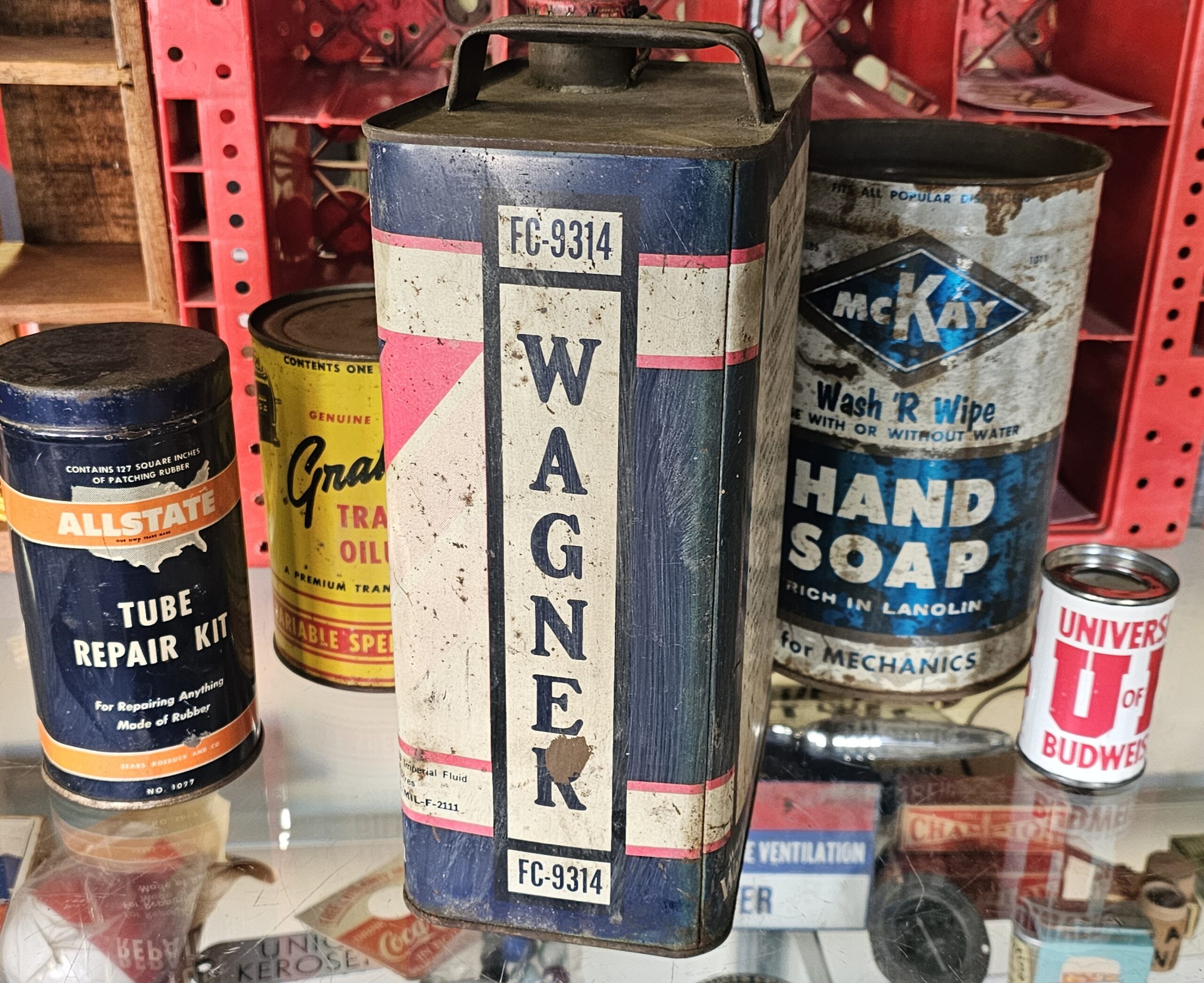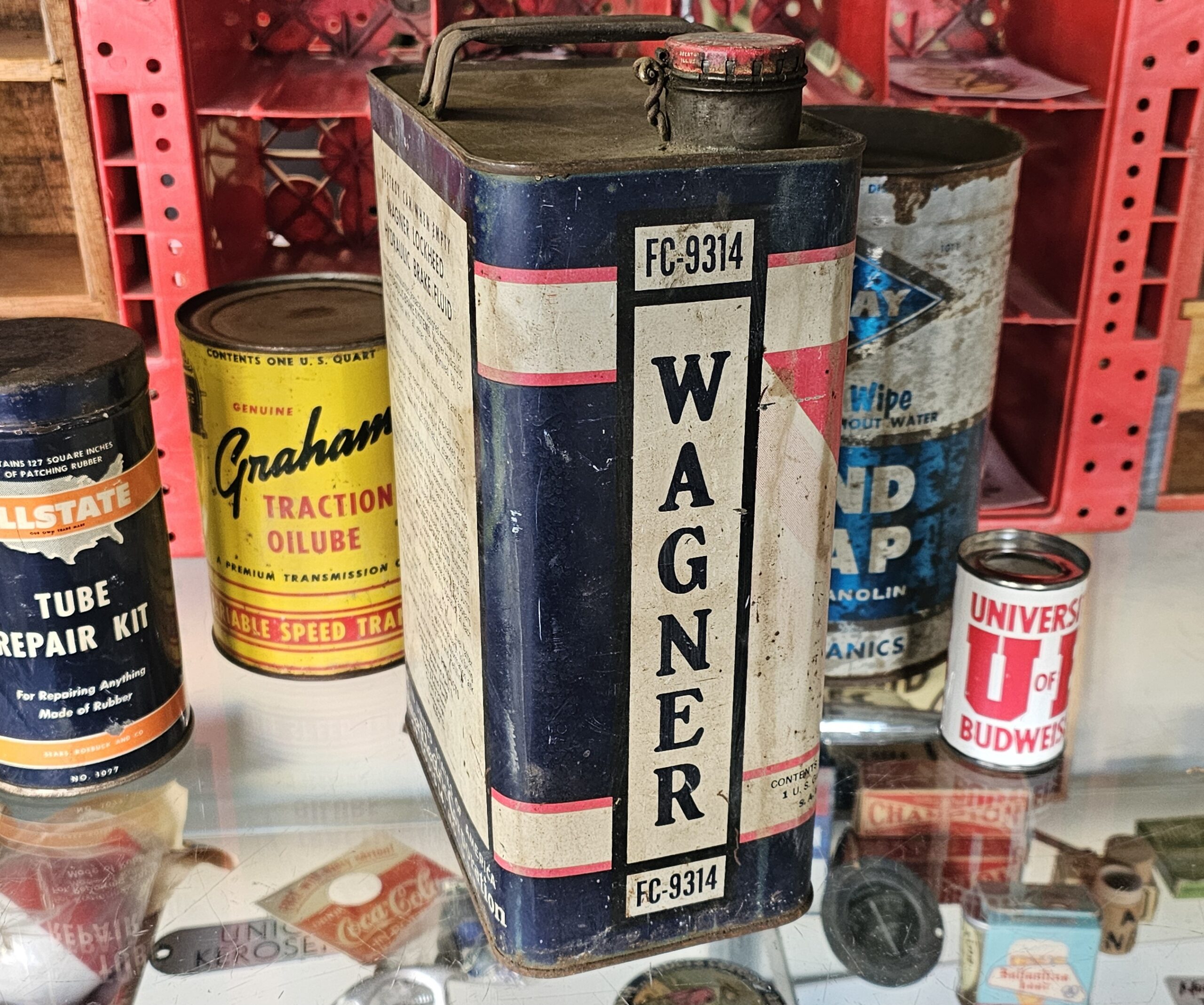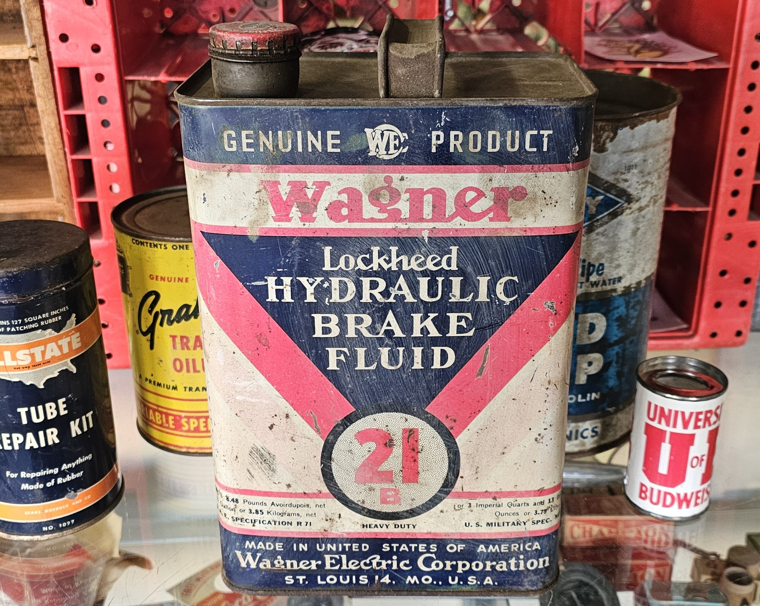 Wagner Lockheed Brake Fluid Can Gallon This is an early version as it does not have a twist style cap, but a bail version. Shows age, but no dents and minimal scratching. ~Half full of original product. Place as vintage décor for your shop or garage. Keep the past alive with original goodies.