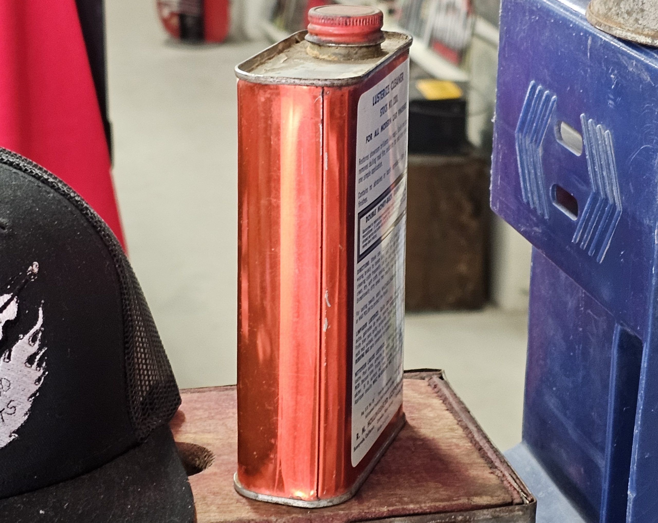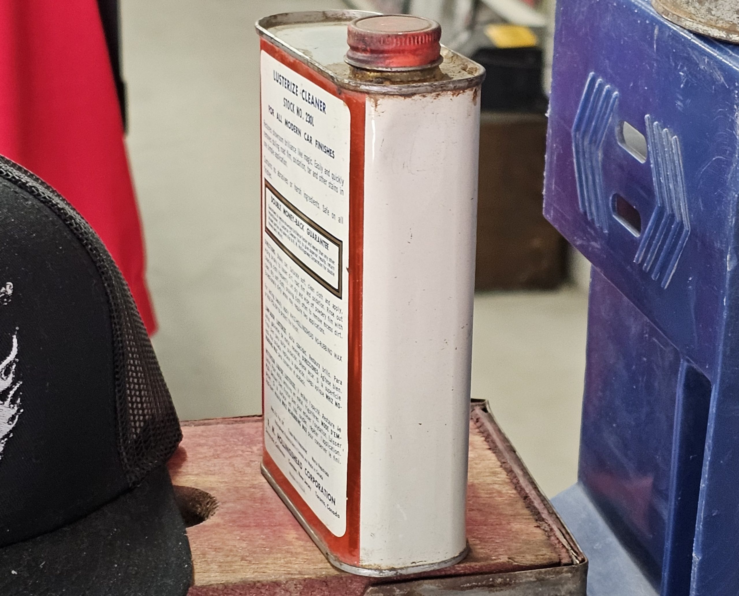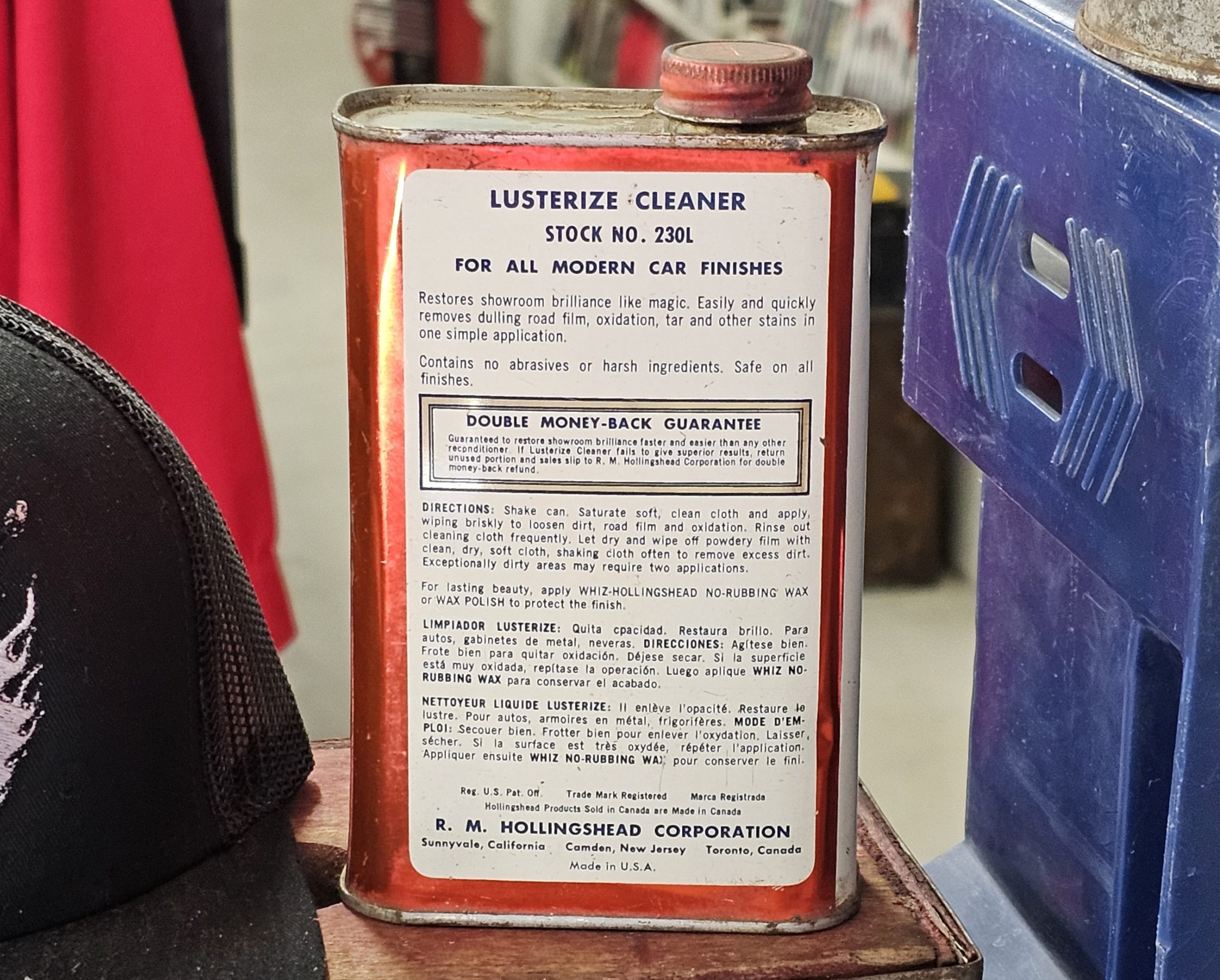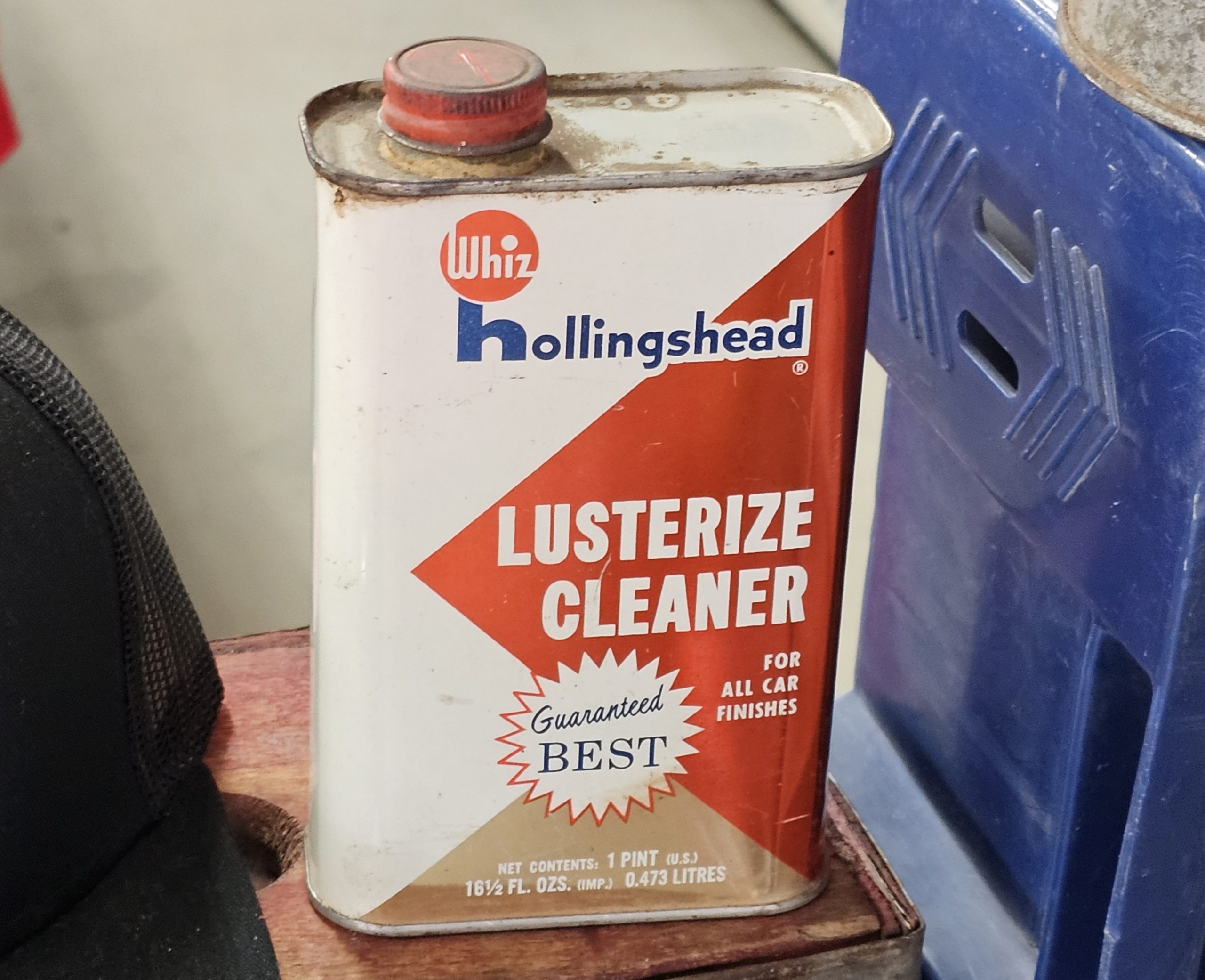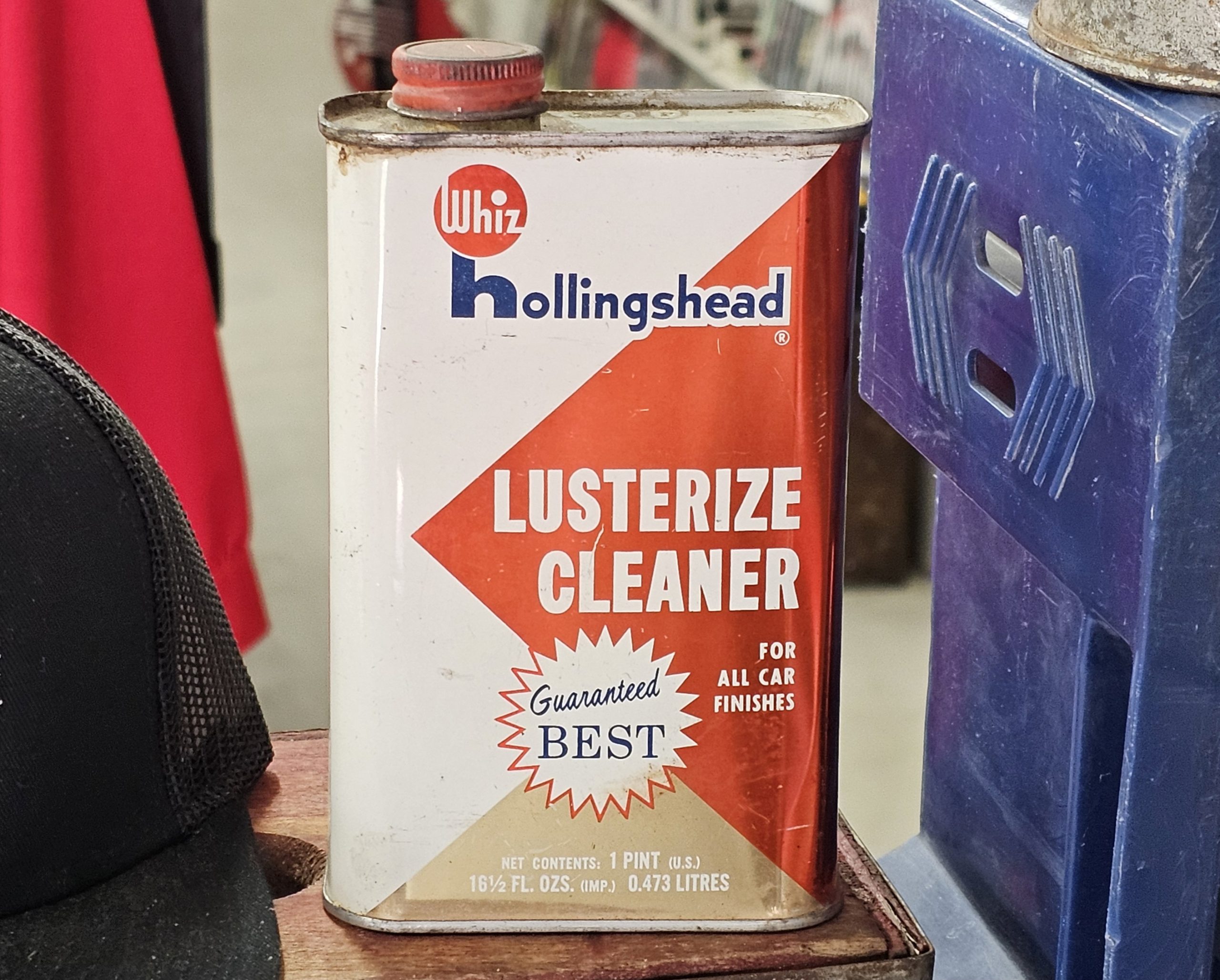 Whiz Hollingshead Lusterize Cleaner Can  This 1960s  tin is in good shape with minimal wear and one small dent on side (see picture).  It says it is for all car finishes, but was also used for furniture in the home.  Has product, but it is all dried up inside.  Has original cap.