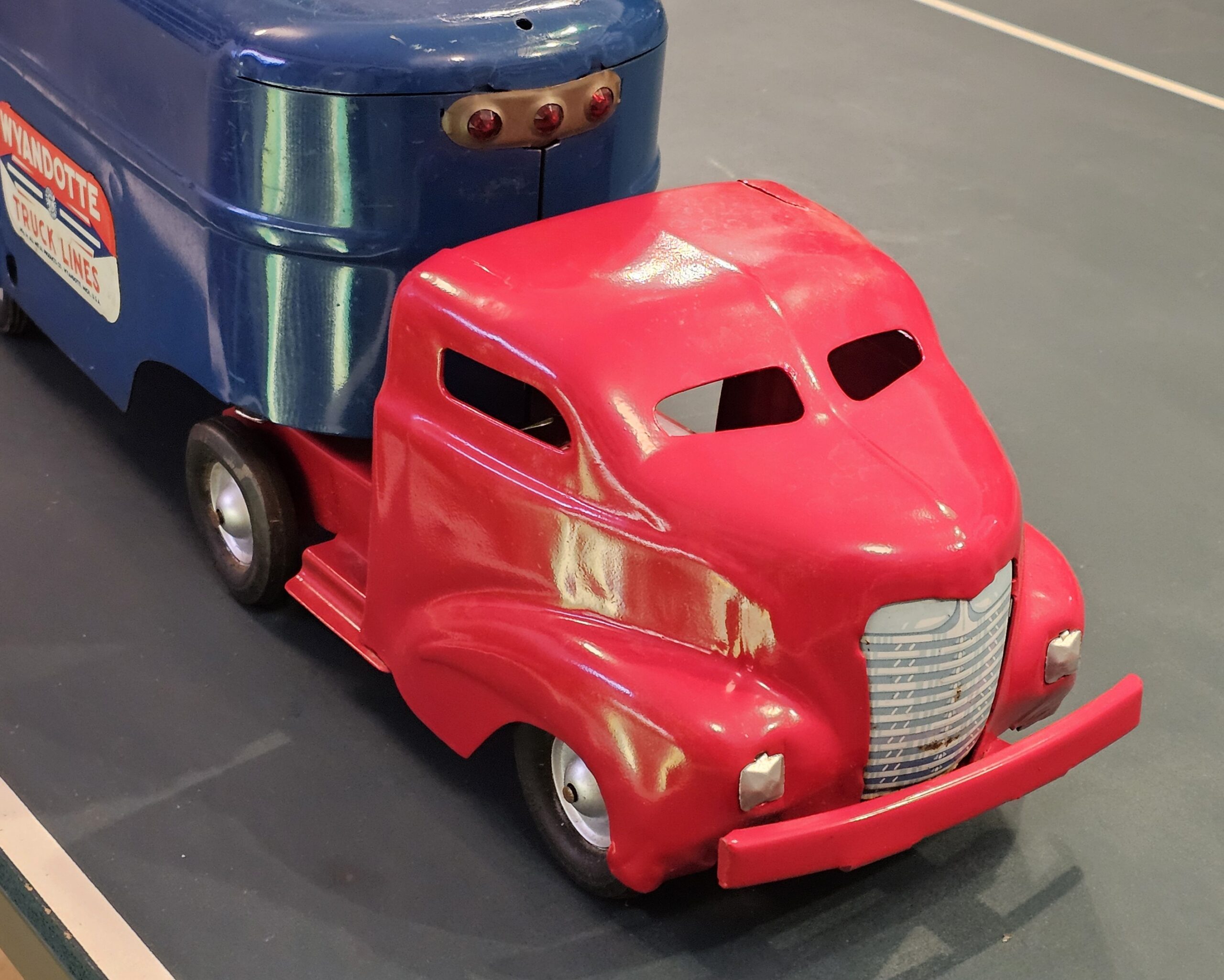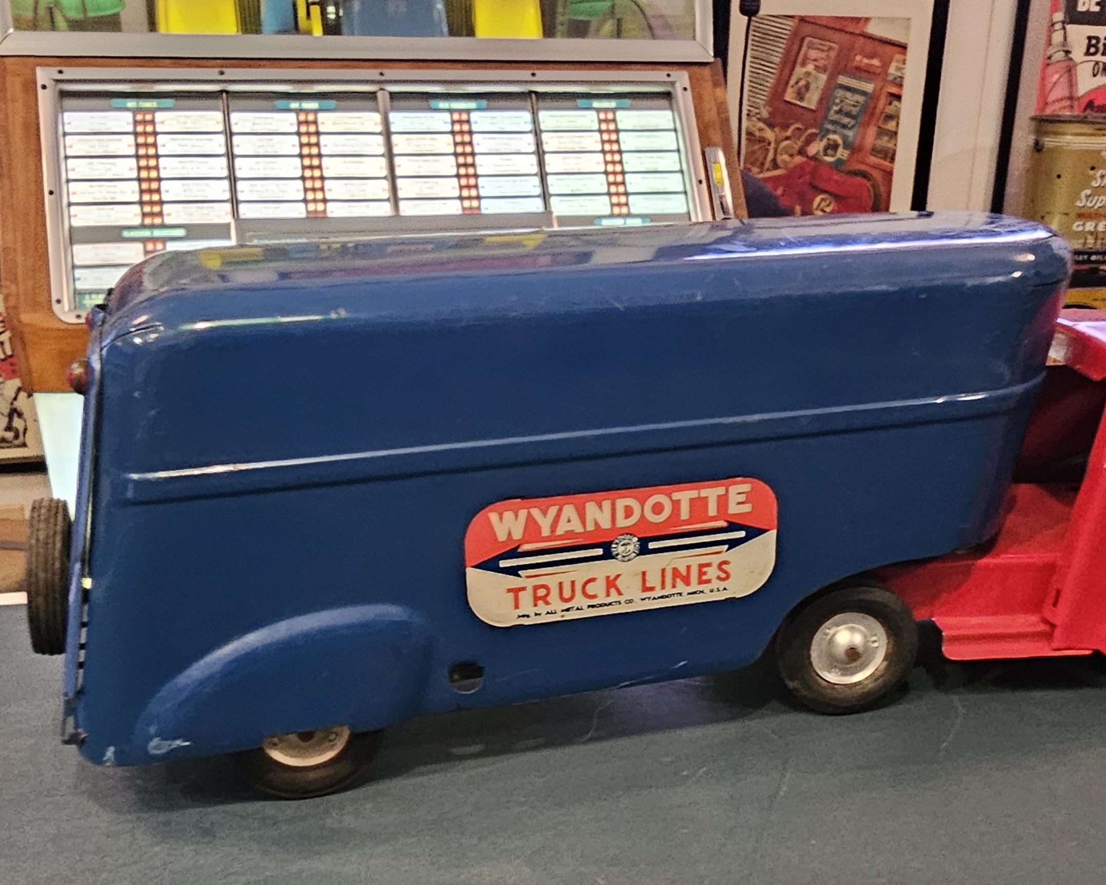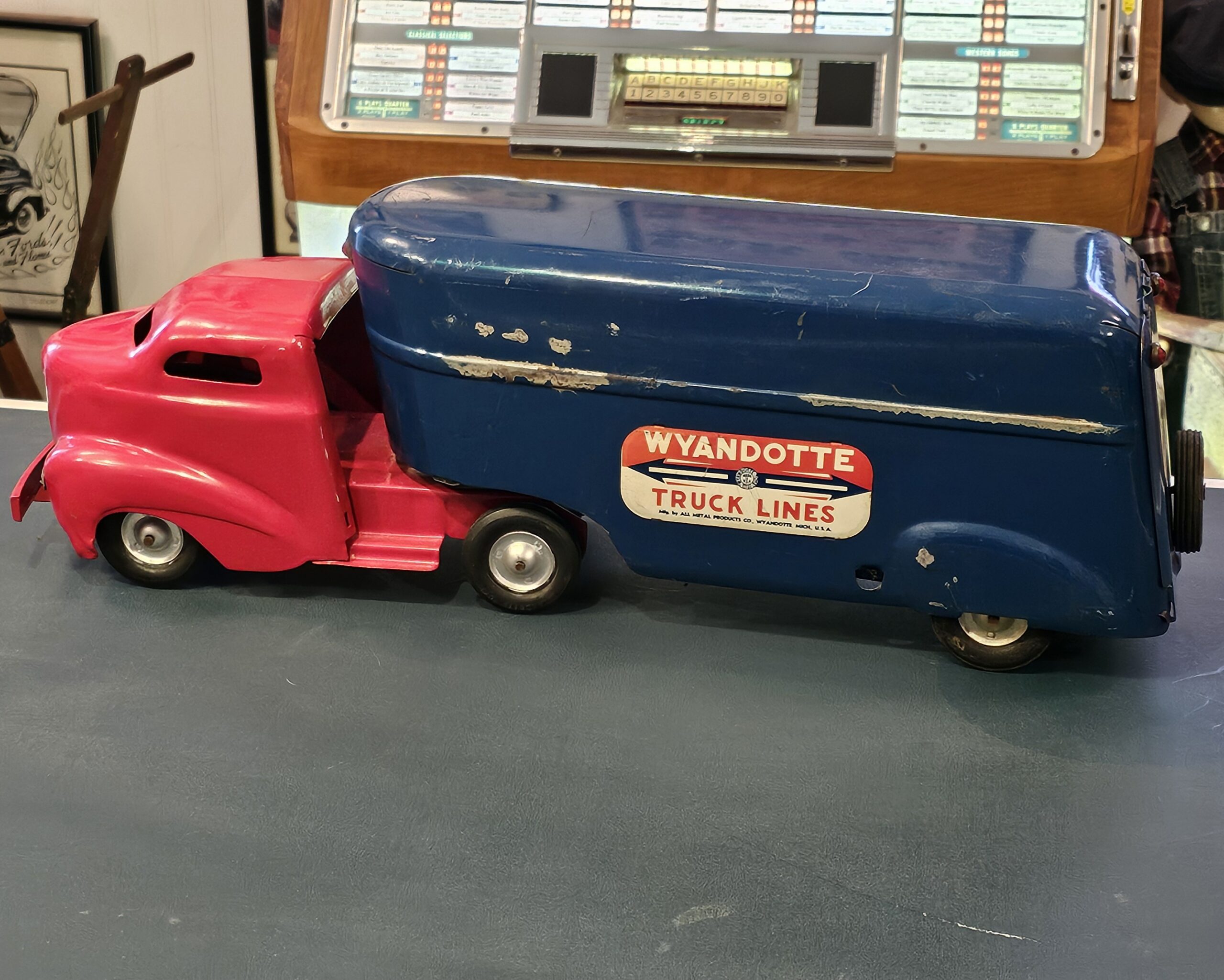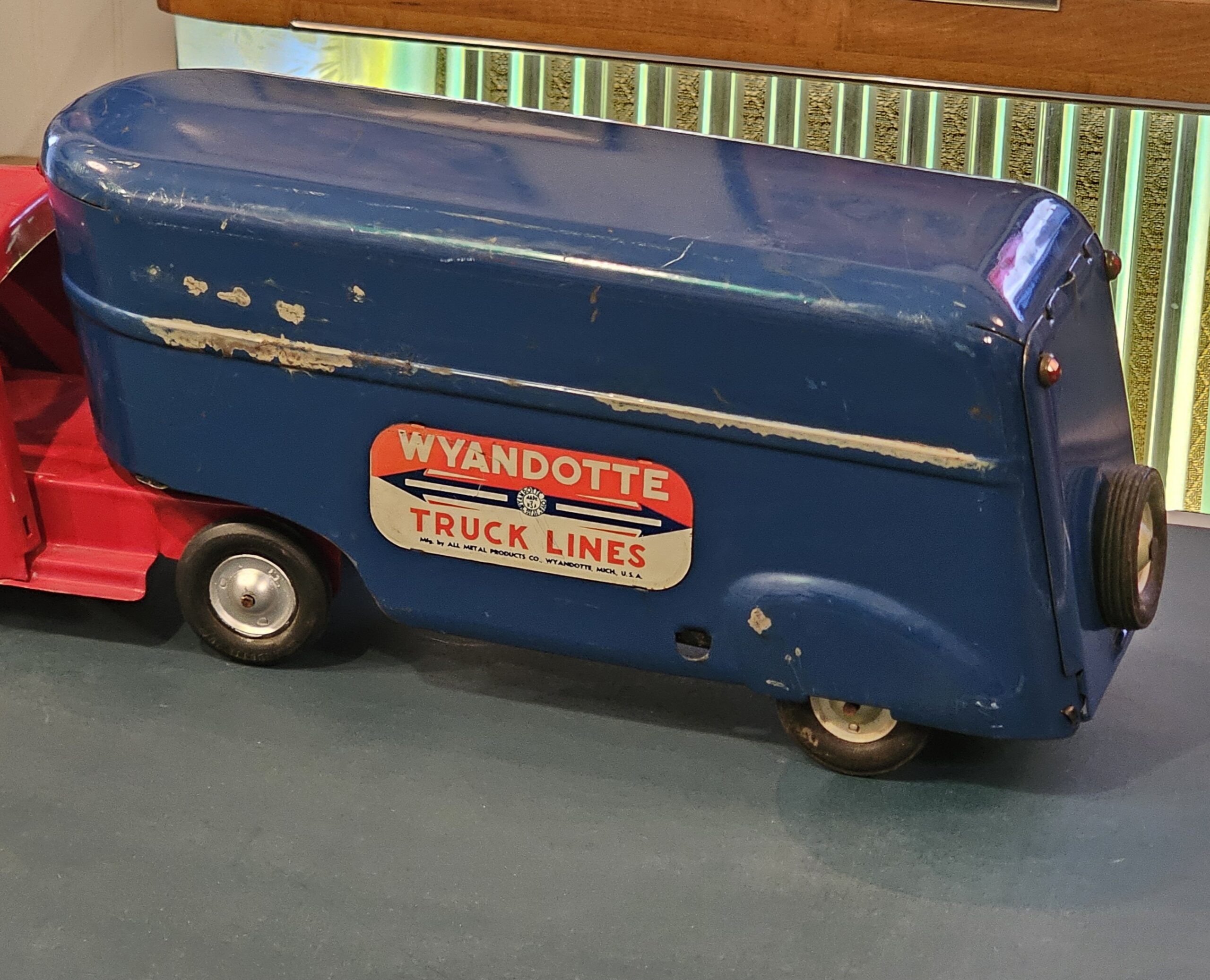 Wyandotte Truck Lines Truck Trailer This original toy is fantastic overall. Has all original reflectors and decals. Left side of trailer has been scratched as pictures show, while right hand side is superb. Hitch has been replaced with a bolt. All original rubber tires as well. Wyandotte toy trucks, produced by the All Metal Products Company of Wyandotte, Michigan, are iconic collectibles known for their durable "pressed steel" construction and distinctive Art Deco-inspired designs. Grumps Collectibles So-Cal.