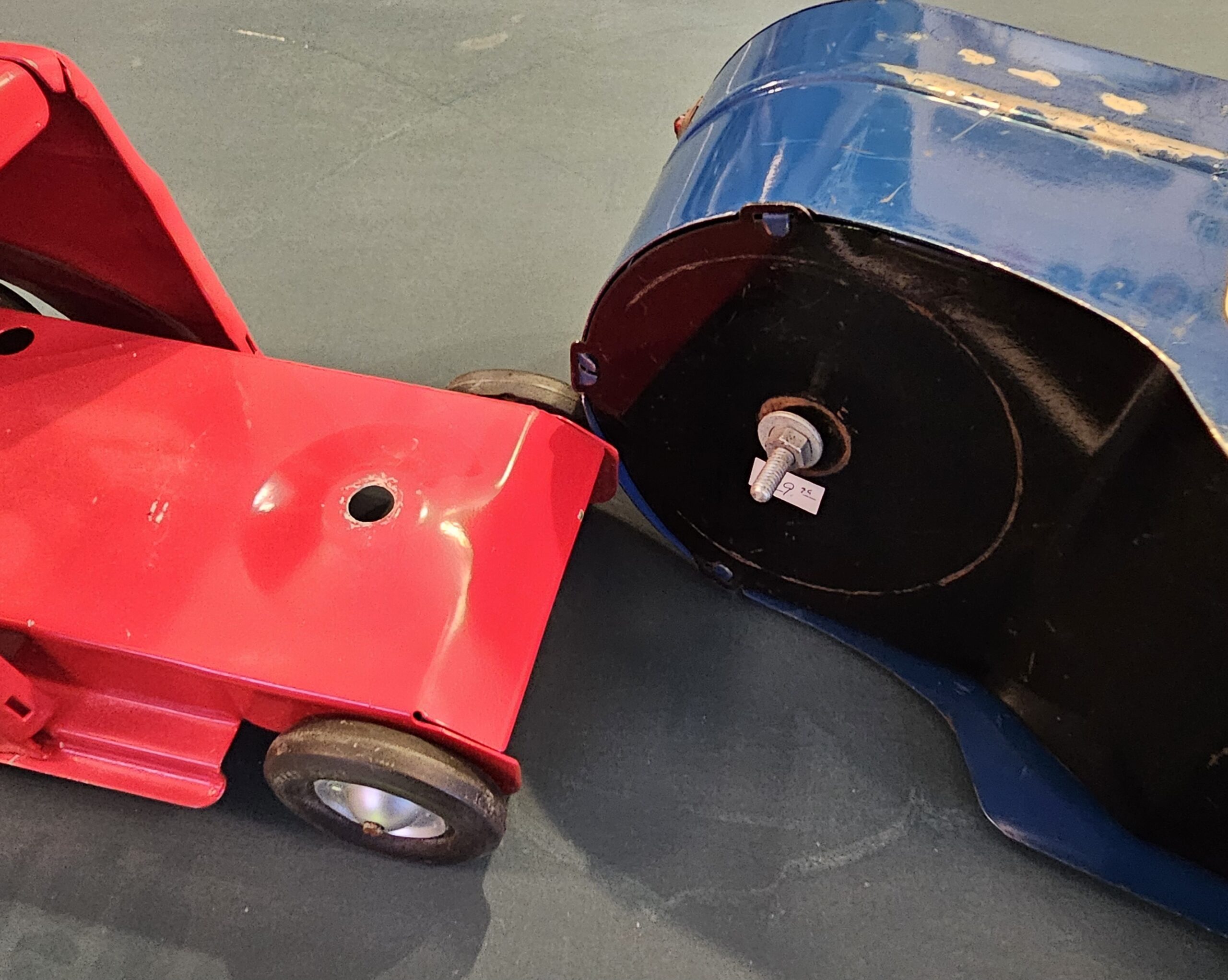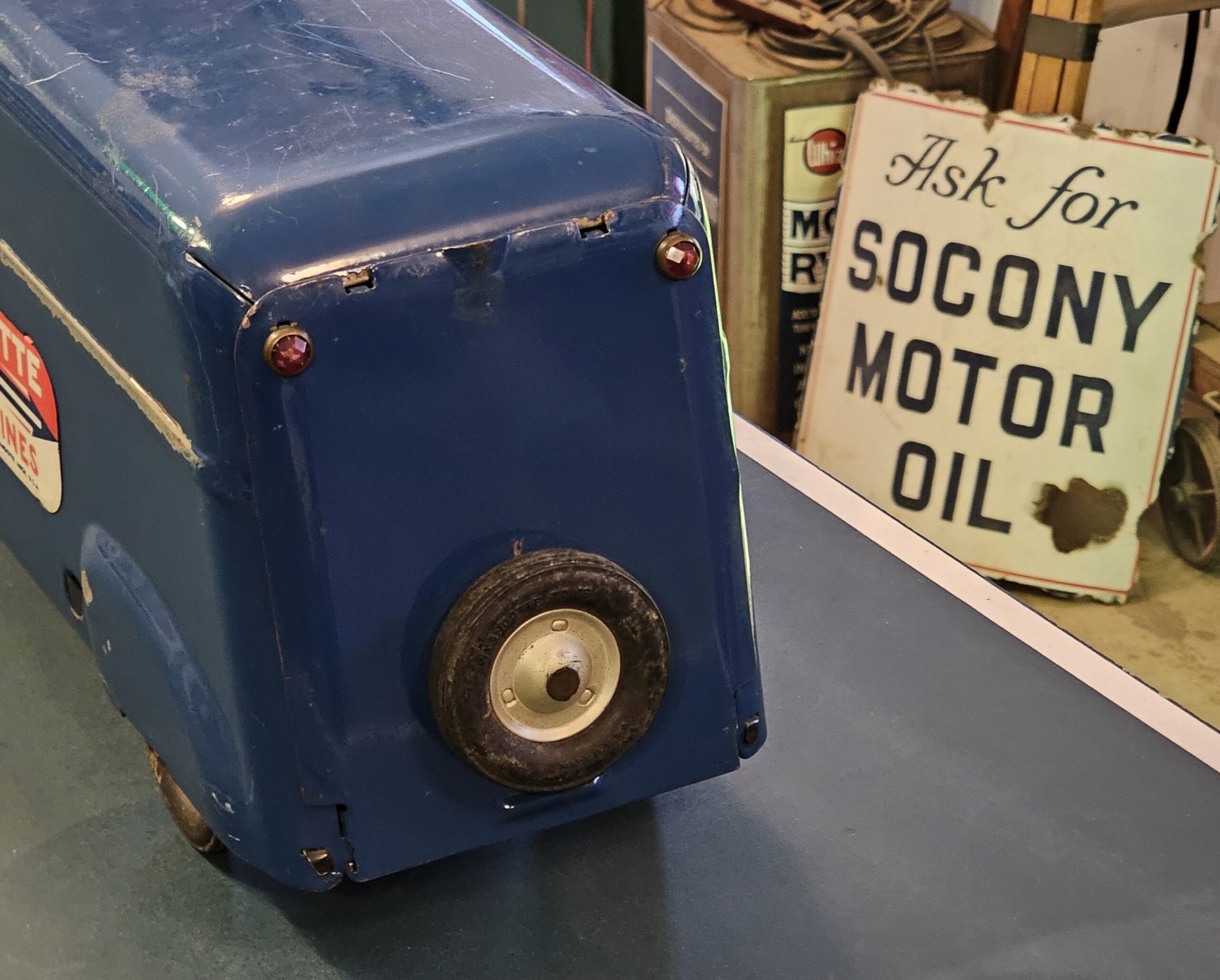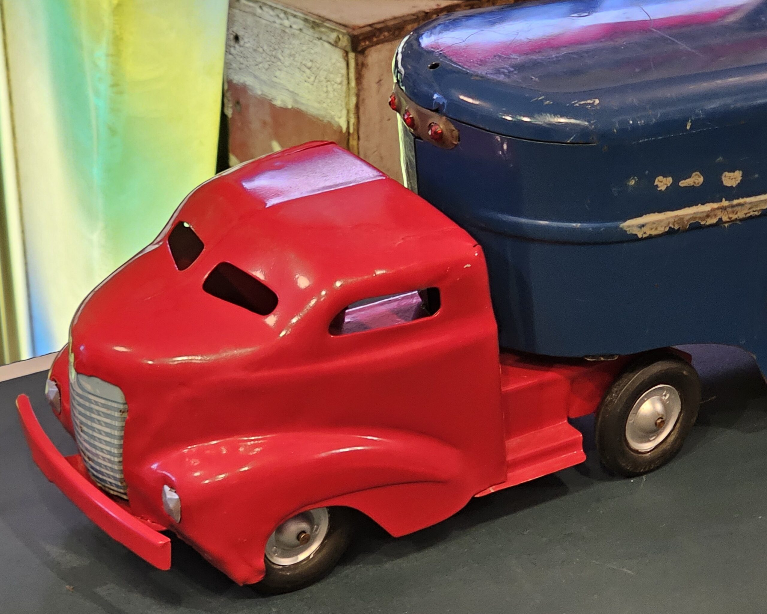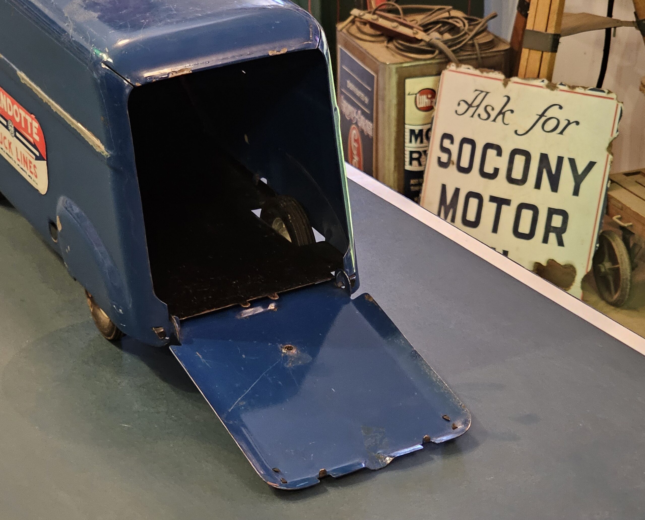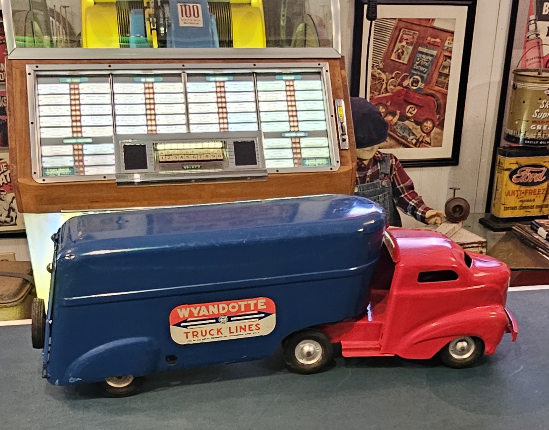 Wyandotte Truck Lines Truck Trailer This original toy is fantastic overall. Has all original reflectors and decals. Left side of trailer has been scratched as pictures show, while right hand side is superb. Hitch has been replaced with a bolt. All original rubber tires as well. Wyandotte toy trucks, produced by the All Metal Products Company of Wyandotte, Michigan, are iconic collectibles known for their durable "pressed steel" construction and distinctive Art Deco-inspired designs. Grumps Collectibles So-Cal.